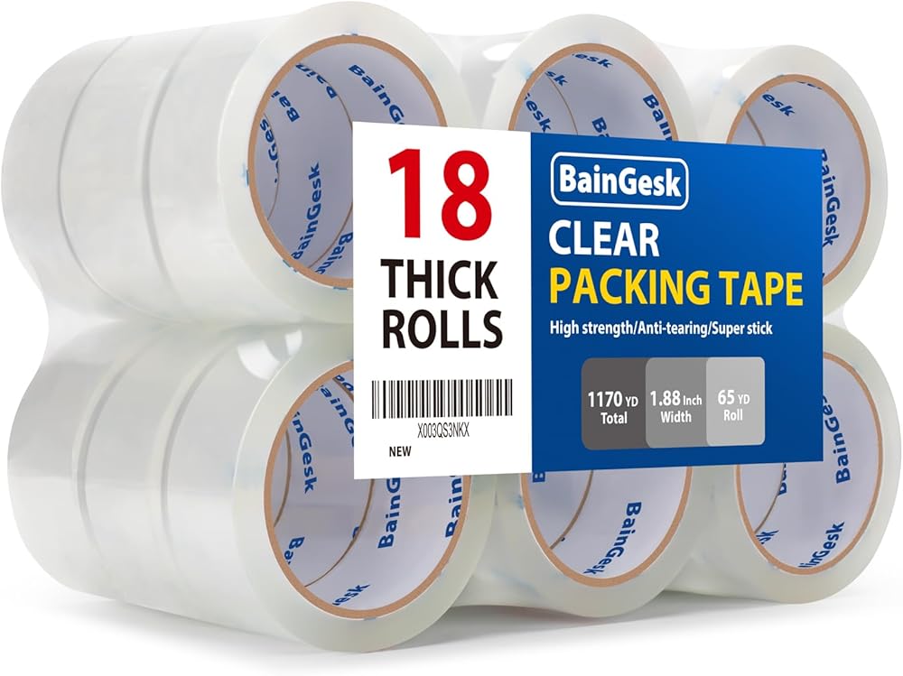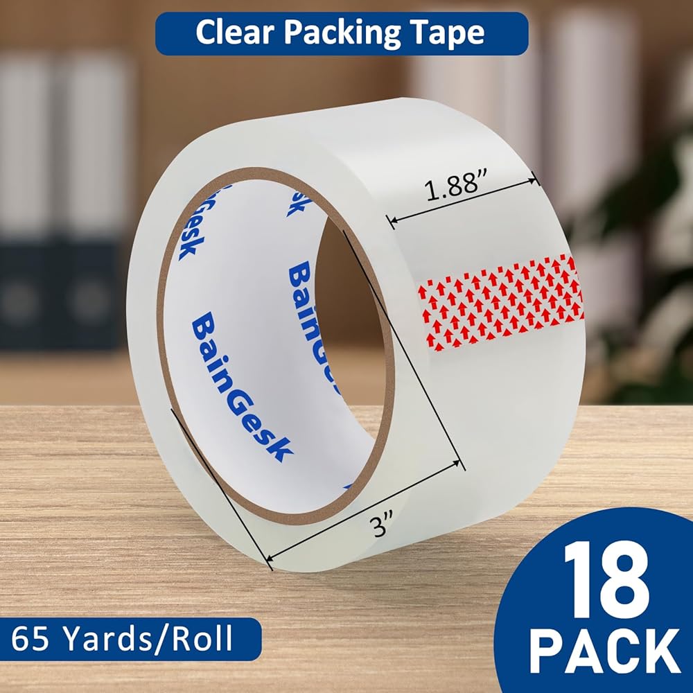 18 لفة من الشريط اللاصق - يبلغ مقاس شريط التغليف الشفاف 65 ياردة × 1.9 انش، بإجمالي 1170 ياردة، قلب 3 انش. مثالية لشحن العبوات المتحركة والختم والتعبئة بسرعة.