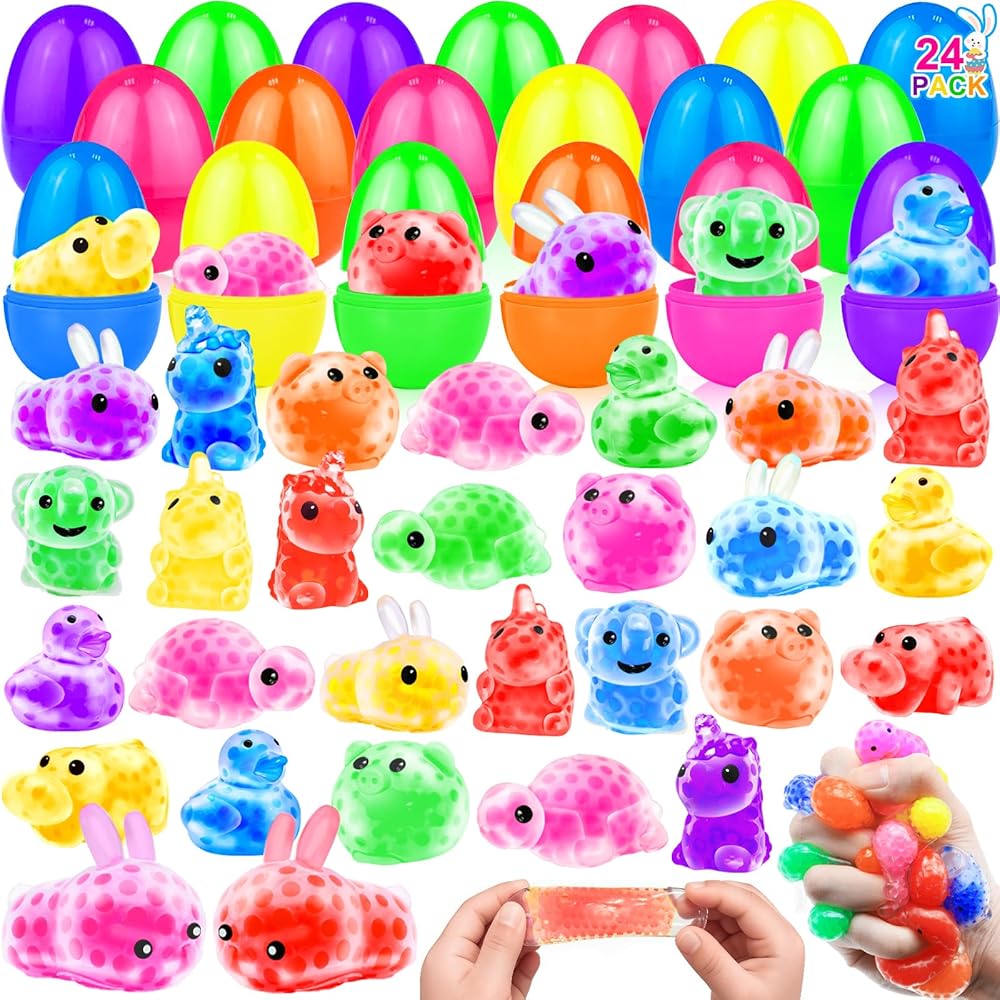 Easter Eggs Prefilled with Toys: you will receive 24 pack Easter eggs prefilled with animals stress balls, including bunnies, puppies, cats, ducks, pigs, elephants, hedgehogs and other 12 forms, bringing a joyful Easter egg hunt experience for kids