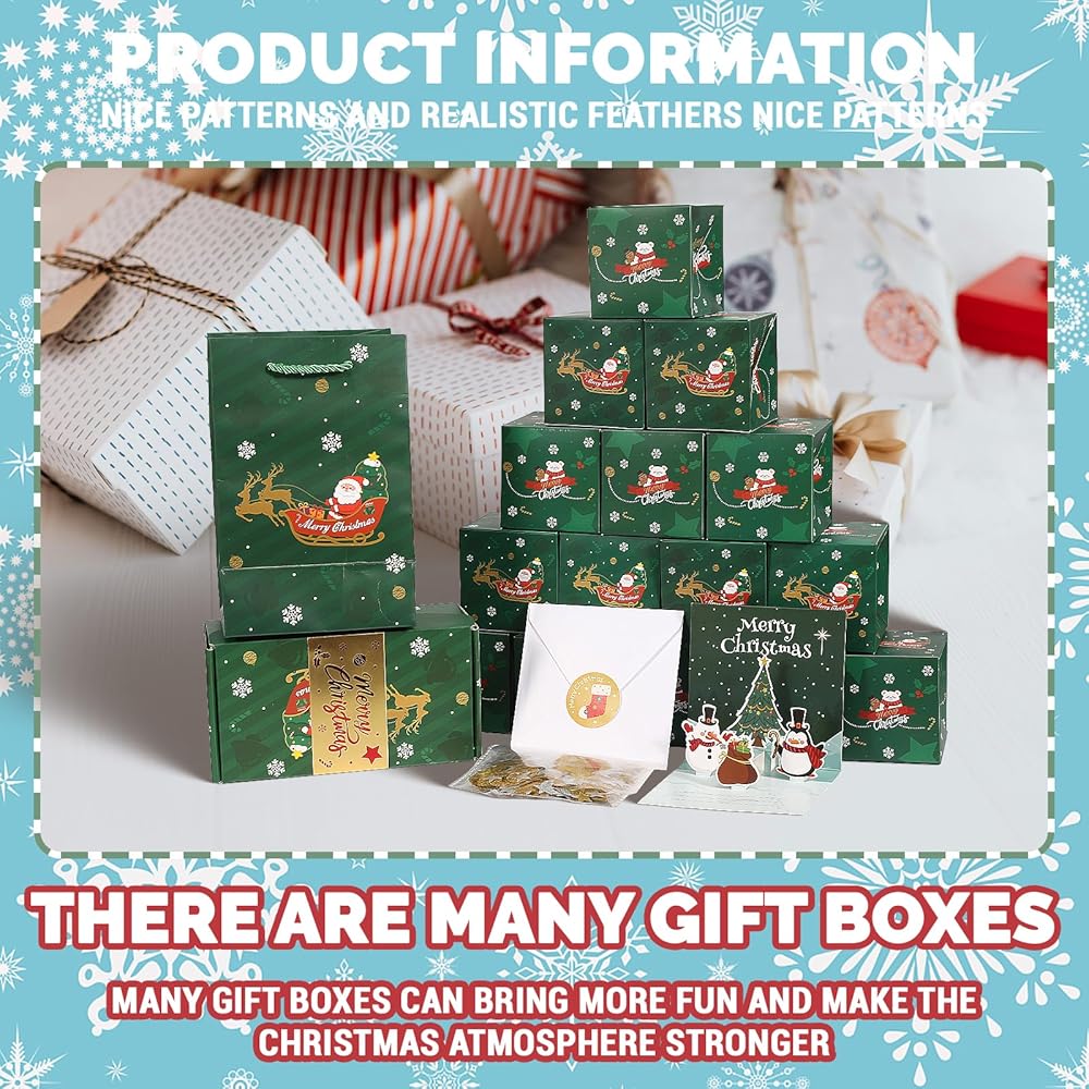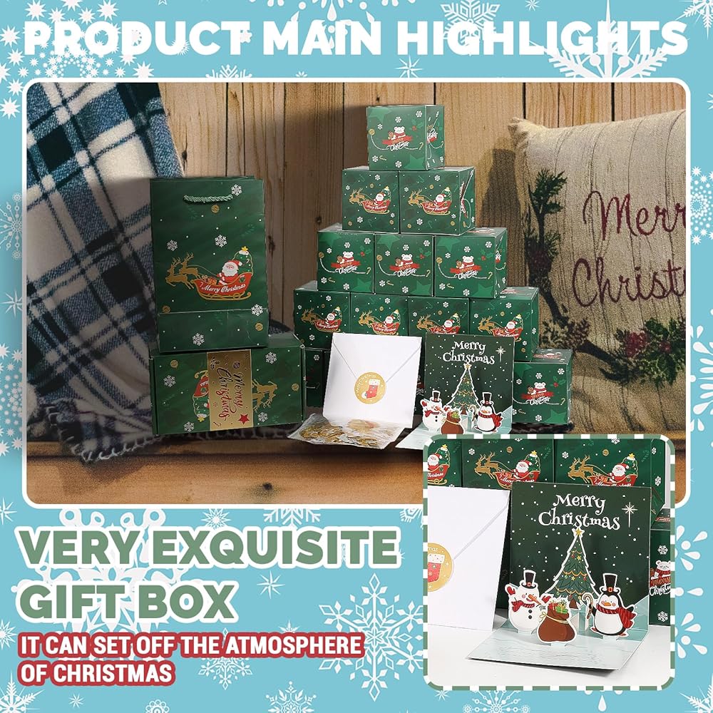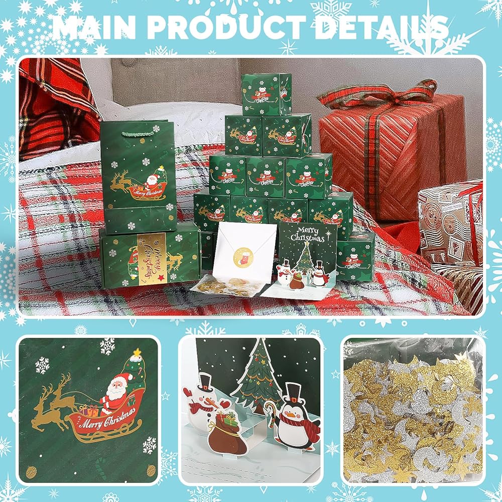 【Szie والحزمة تشمل】 الحجم: مربع الانفجار الصغير حوالي 2.95* 2.95* 2.95 بوصة ؛ صندوق الهدايا حوالي 7.48*3.94*3.15 بوصة ؛ حقيبة الهدايا حوالي 7.87*4.72*3.54 بوصة. تشمل الحزمة: مربع الانفجار الصغير*20 ، صندوق الهدايا*1 ، حقيبة الهدايا*1 ، بطاقة عيد الميلاد*1 ، Envivor*1 ، ملصق*1 ، النجوم والحلويات*1.