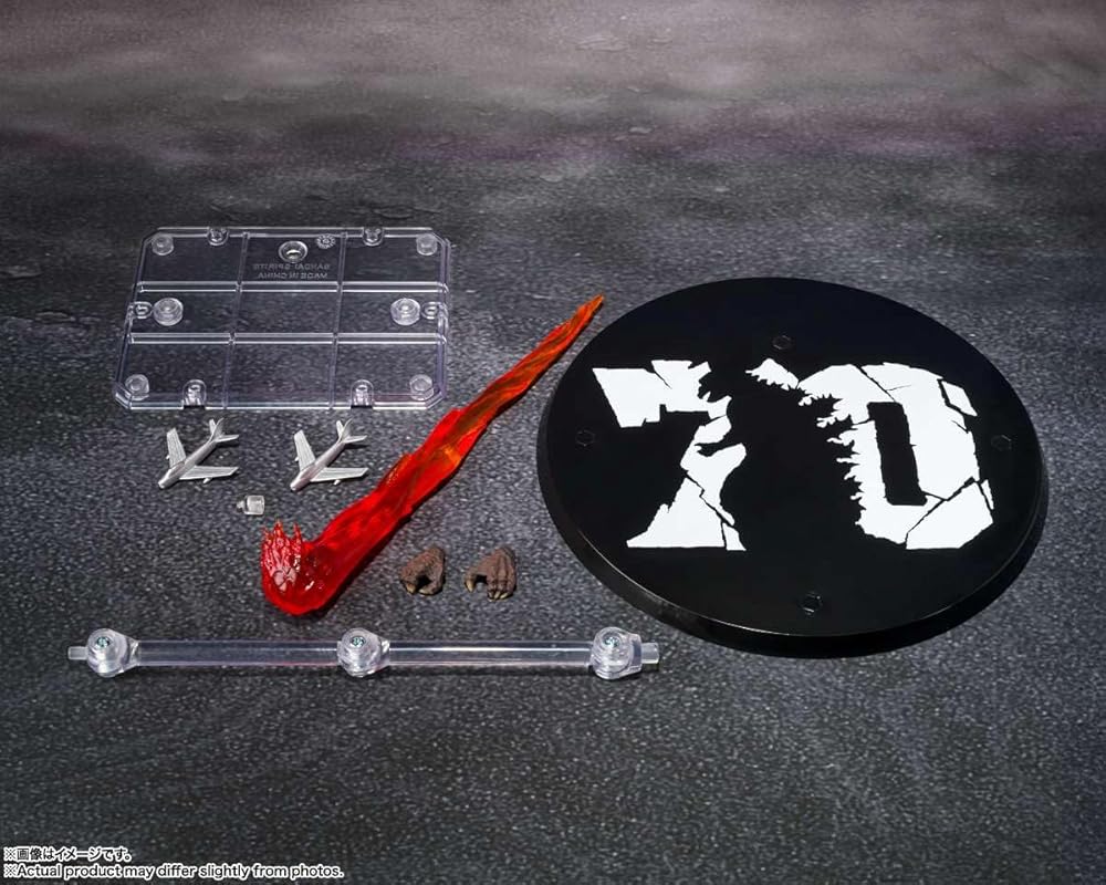 The figure has been sculpted and colored by Yuuji Sakai, the leading Godzilla sculptor. The figure is painted in the image of the movie posters of the time, and the intricate details recreate the impression of the suit from that time. By using the interchangeable left and right wrist parts, it is possible to hold the included airplane. In addition, a radiation heat ray effect is included, so you can enjoy displaying it in the image of the poster. In addition, a "Godzilla 70th Anniversary Logo Pedestal" is included to commemorate the 70th anniversary of "Godzilla". [Set Contents] Main body, Interchangeable hand parts (L/R), Radiation heat ray effect parts, Airplane parts x 2, Stand