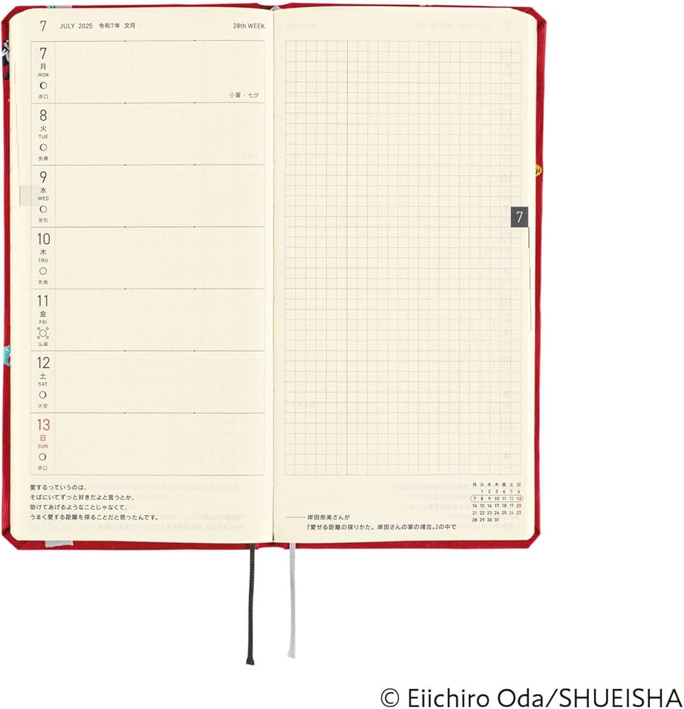 التصميم المزدوج الانتشار - الانتشار الأسبوعي على الجانب الأيسر ، وورقة الرسم البياني الفارغ على الجانب الأيمن. يسمح لك هذا التصميم بعرض جدولك بسهولة في لمحة أثناء تدوين الملاحظات وخطط الرسم في نفس الوقت. يتضمن الانتشار الأسبوعي اقتباسًا تم اختياره خصيصًا من موقعه الأم ، وهي مجلة الويب اليابانية Hobo Nikkan Itoi Shinbun. التقويم الشهري ، وهو مفيد عند إدارة الجداول ، موجود في صفحة البداية من الانتشار الأسبوعي.