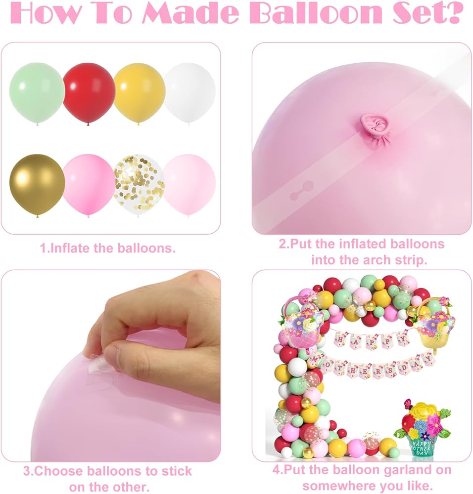 • من السهل التجميع: من السهل تجميع زينة البالون في يوم أمهاتنا من طقم قوس بالون زهرة الربيع ولا تتطلب أي أدوات أو مهارات خاصة. ما عليك سوى تفجير البالونات وربطها معًا باستخدام الشريط المضمّن. يمكنك استخدام إكليل البالون كخلفية كشك للصور ، أو زخرفة الحفلات ، أو زخرفة الغرفة.