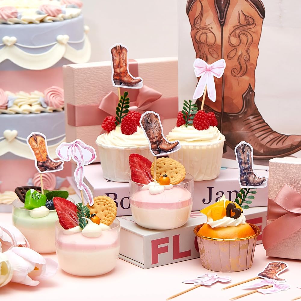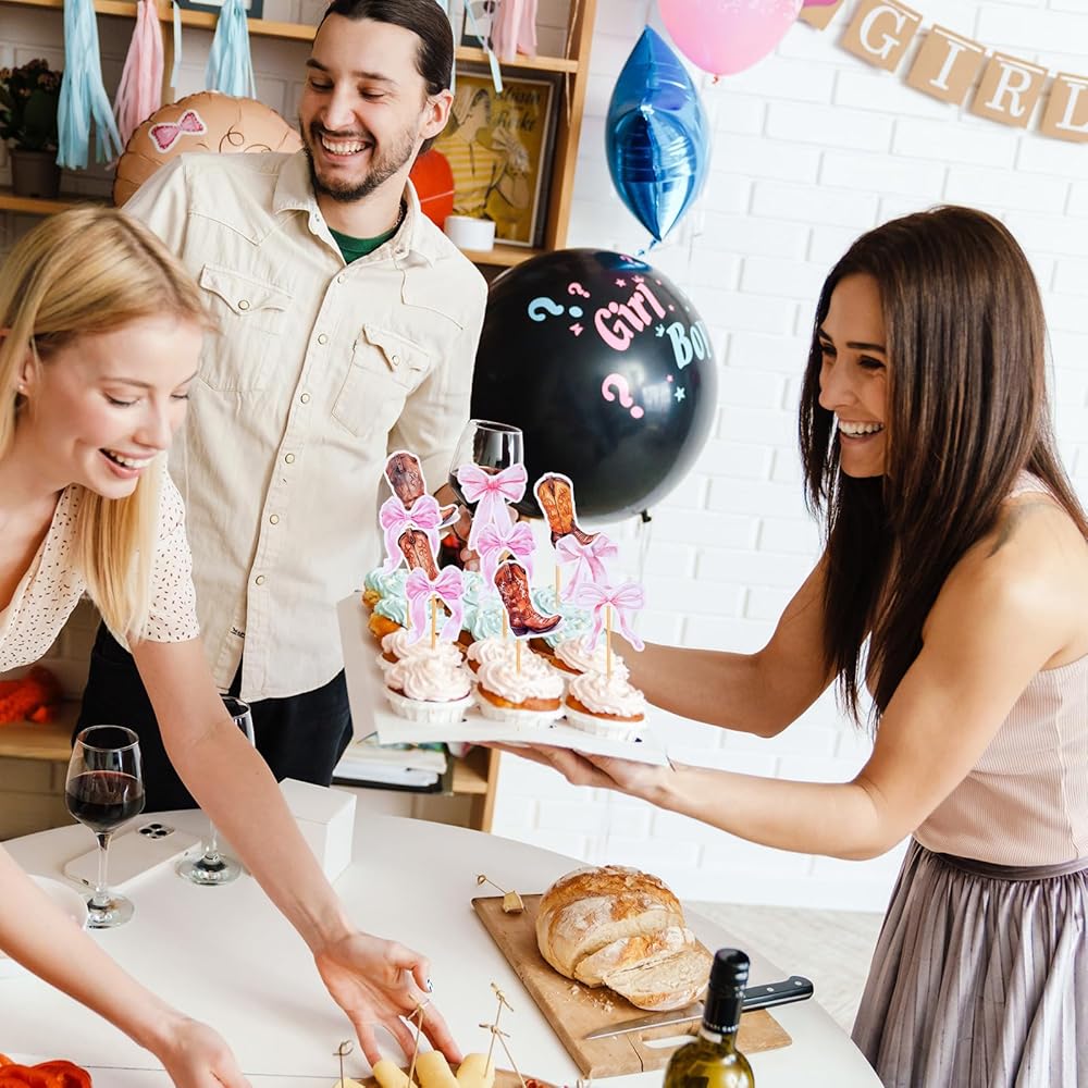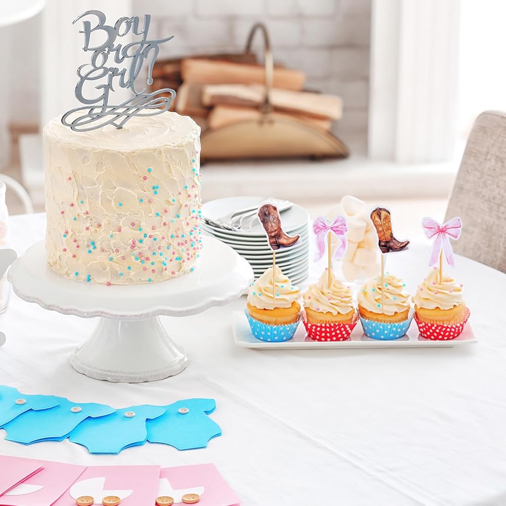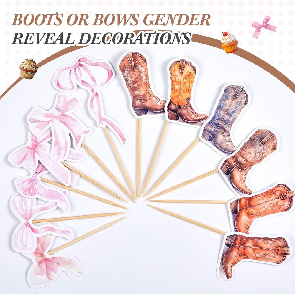 Enhance your party with these boots and bows gender reveal cupcake toppers, suitable for adding a personal touch to cupcakes, ice creams, and fruit creations. They're designed to create a festive atmosphere, ensuring every bite is as memorable as the occasion itself.