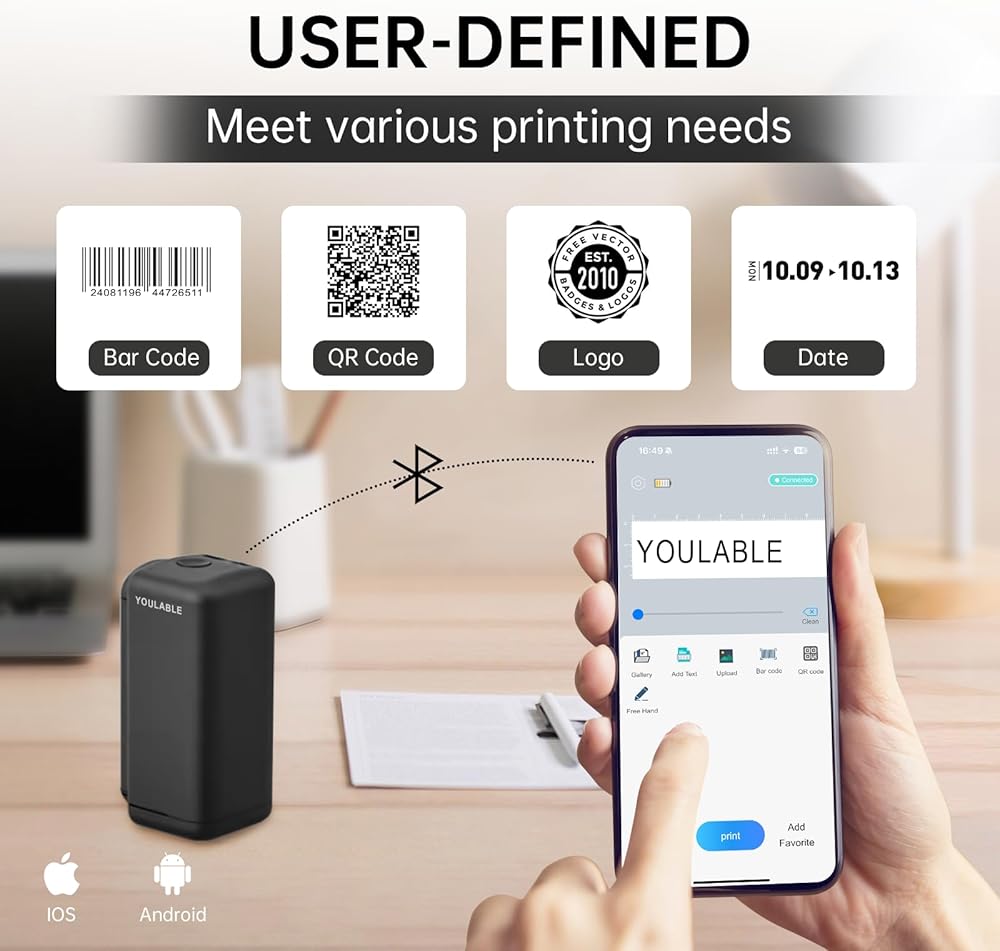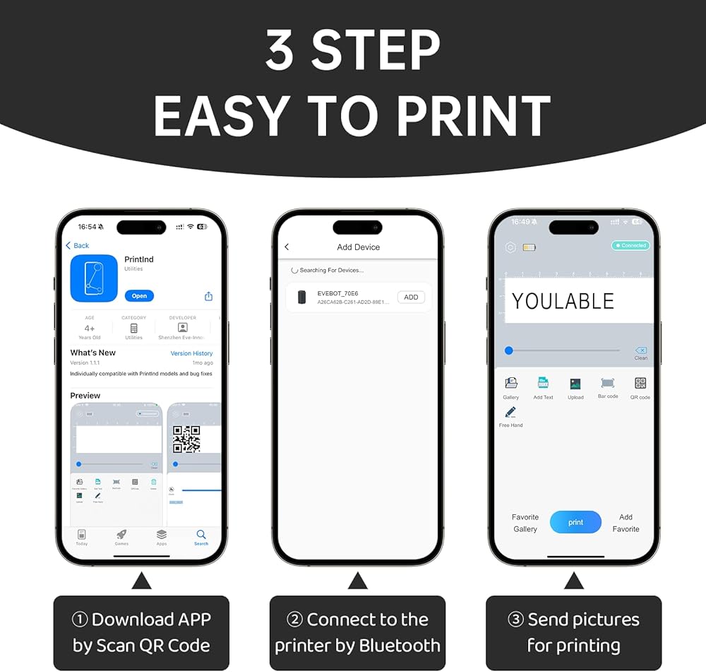 الطباعة الذكية : الاتصال عبر البلوتوث ، سيتم إجراء كل عمليتك على تطبيق PrintInd. يدعم 17 لغة ، سهلة التشغيل والتدريب مجانًا. دقة الطباعة هي 300 نقطة في البوصة مع مستوى رمادي قابل للتعديل.