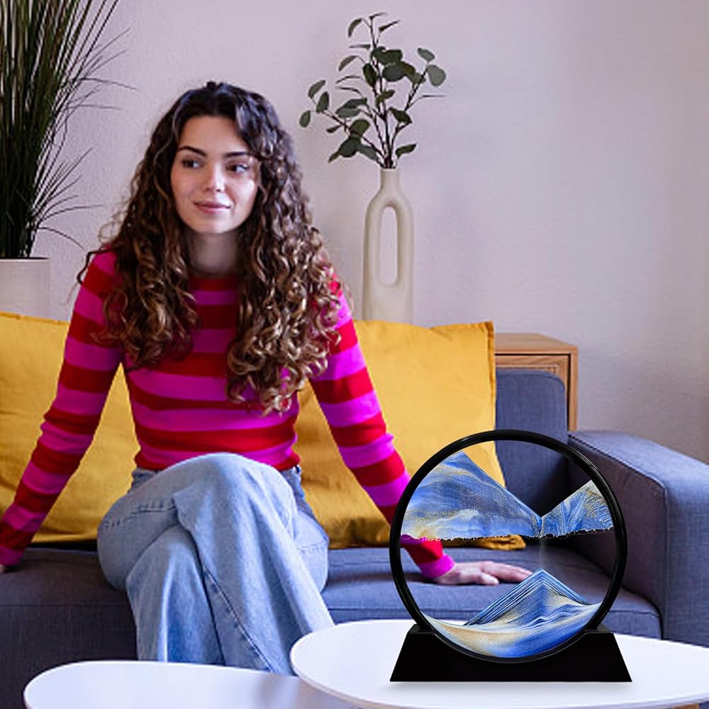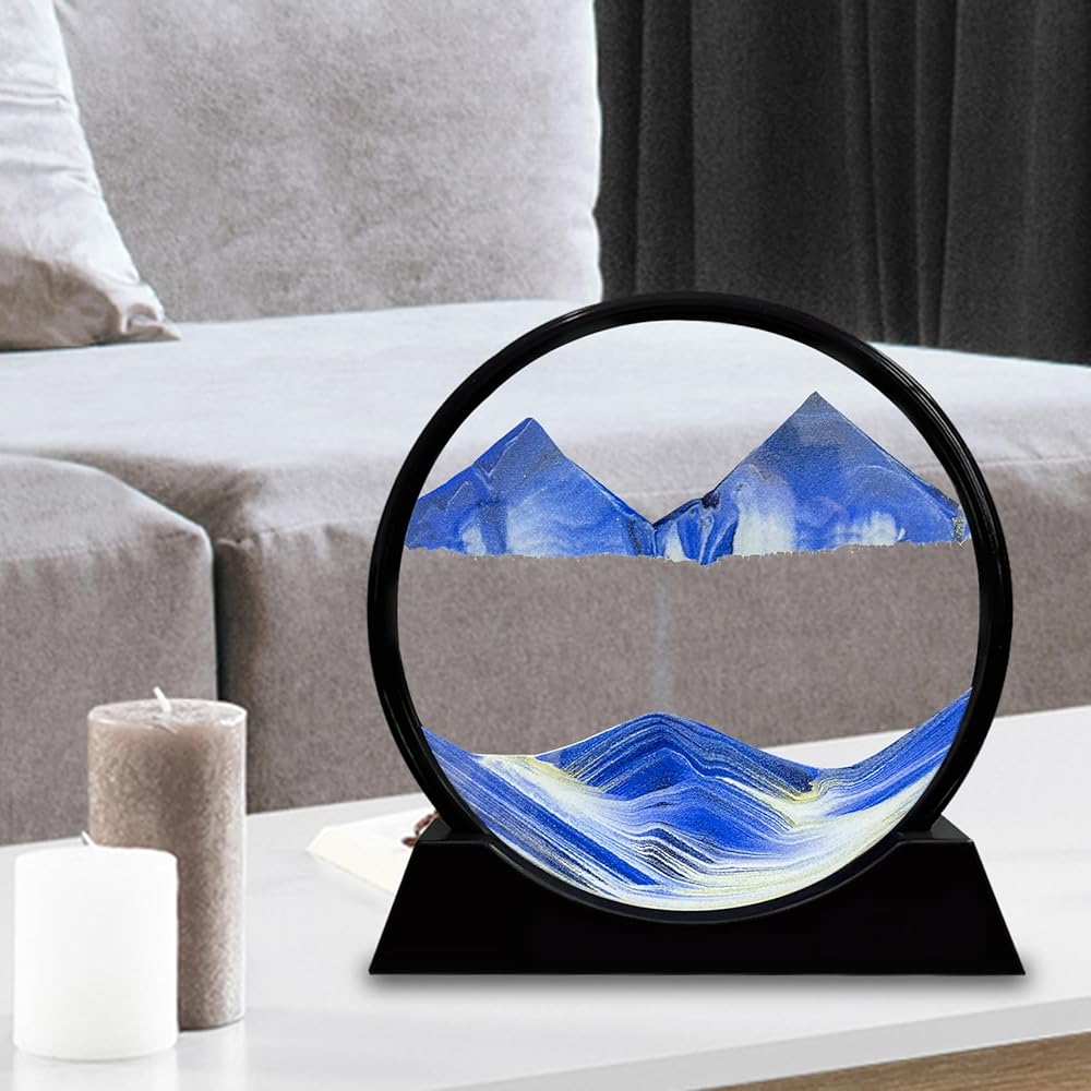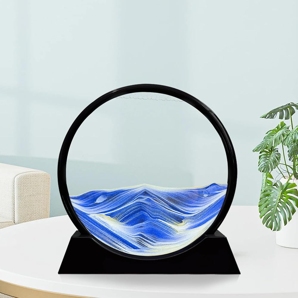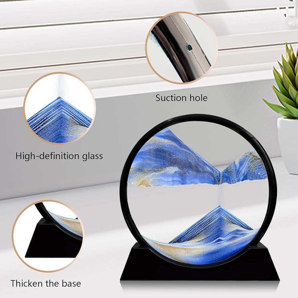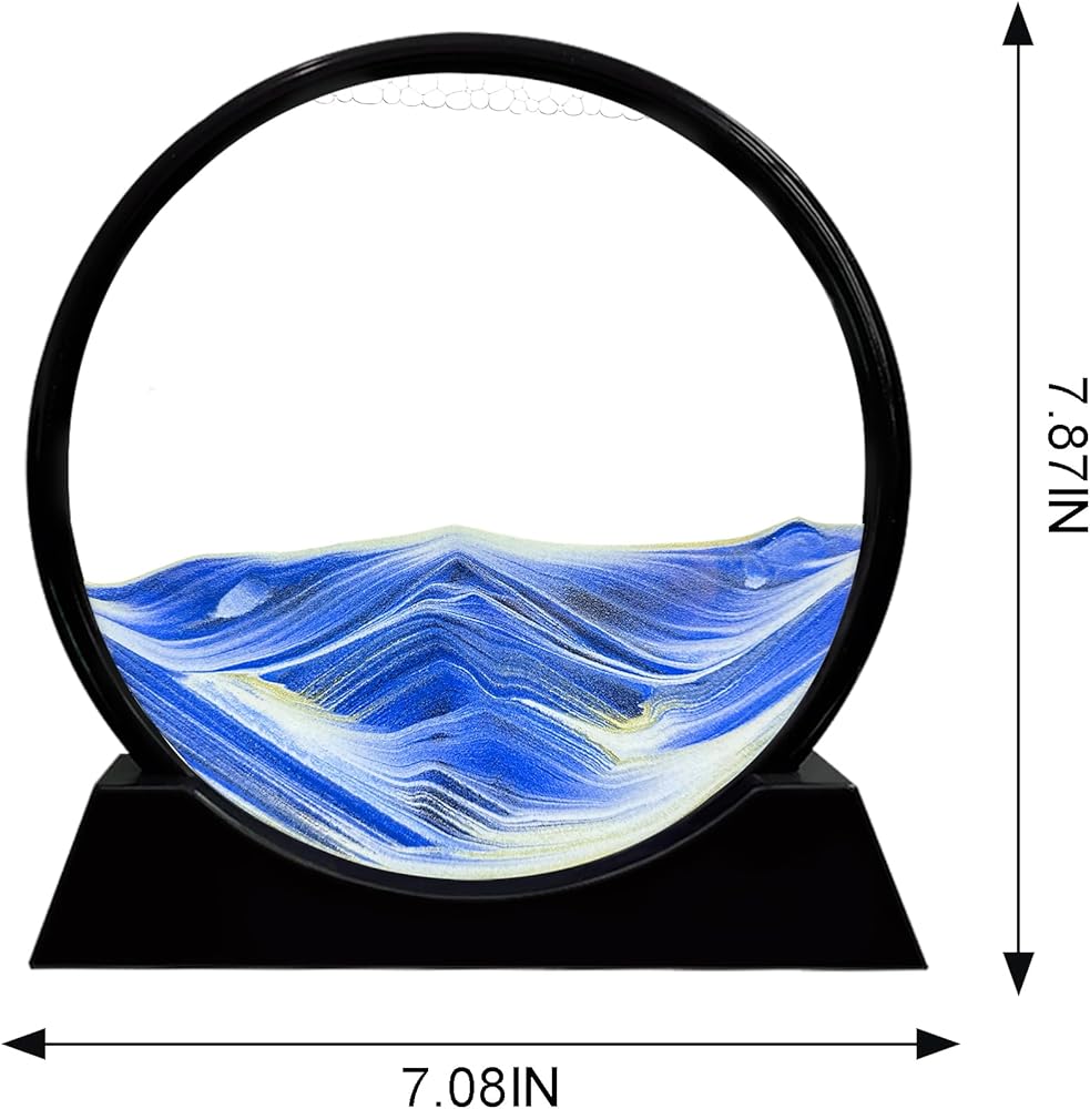 Laenshi Moving Sand Art Picture Round Glass Moving Sand Art Liquid Motion 3D Seal Sea Sandscapes in Motion for Come Constaring Toys Decor Office Office Home (Blue ، 7 ")