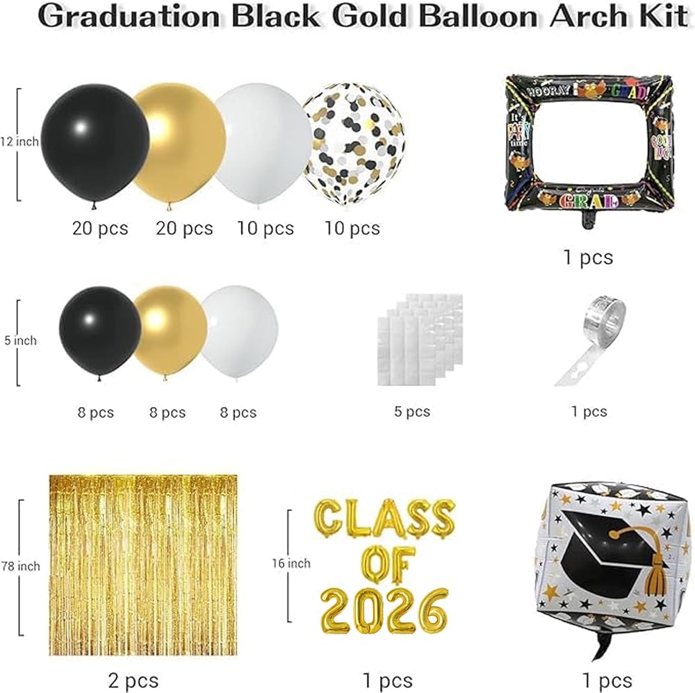 • perfect تشمل إكليل البالون المثالي التخرج: البالونات الزخارف التي تدور حول التخرج 20pcs البالونات السوداء 12 بوصة ، 20pcs بالون الذهب 12 بوصة ، 10pcs 12 بوصة بالون بيضاء ، 10pcs بالون الذهب الأسود ، والبالينات البيضاء ، 8pcs 5 بوصة ، و 8pcs الذهب الذهب 5 بوصة ، فئة 2023 البالونات احباط ، 2pcs التخرج بالون.