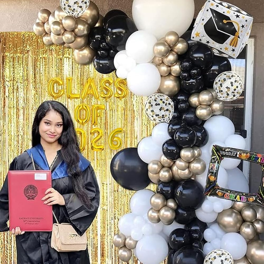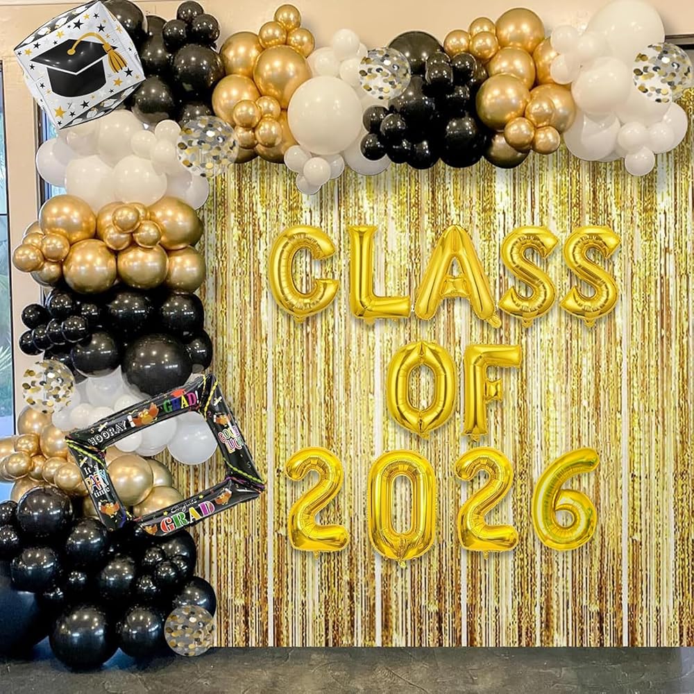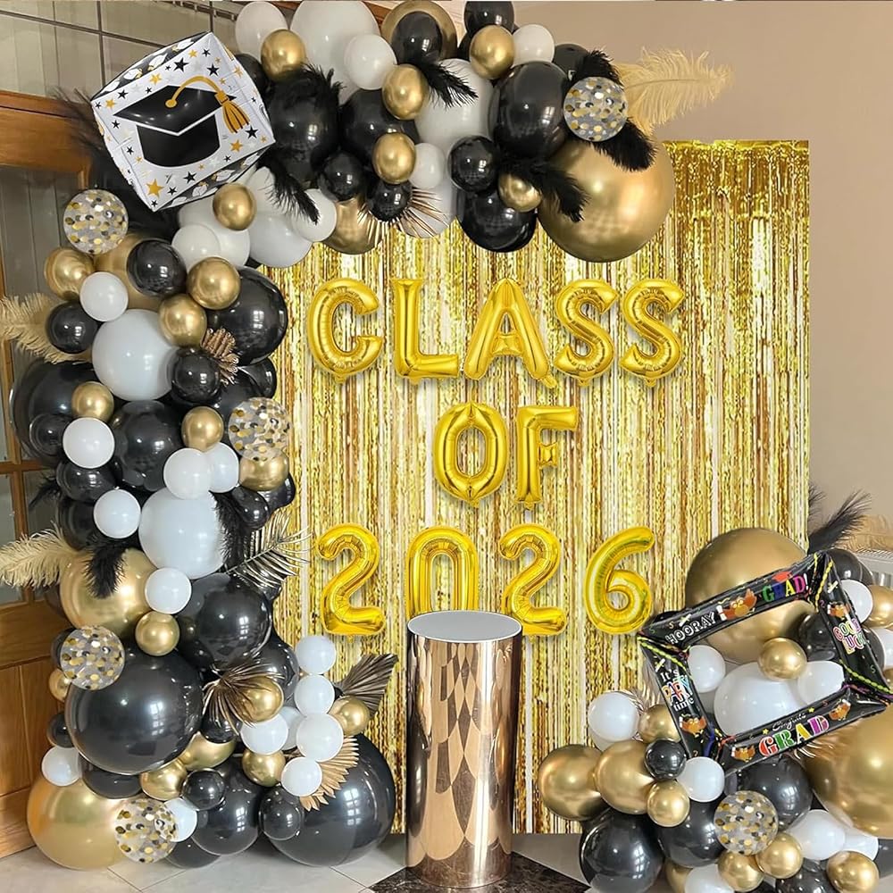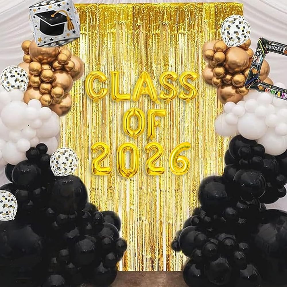 طقم جانيونس جارلاند جارلاند جارلاند تخرج من جانيونز مع فئة من 2025 بالون رقائق البالون و 78 بوصة الستائر الهامش الخلفية - 2025 ديكورات التخرج مع البالونات الذهبية البيضاء السود