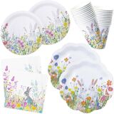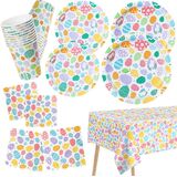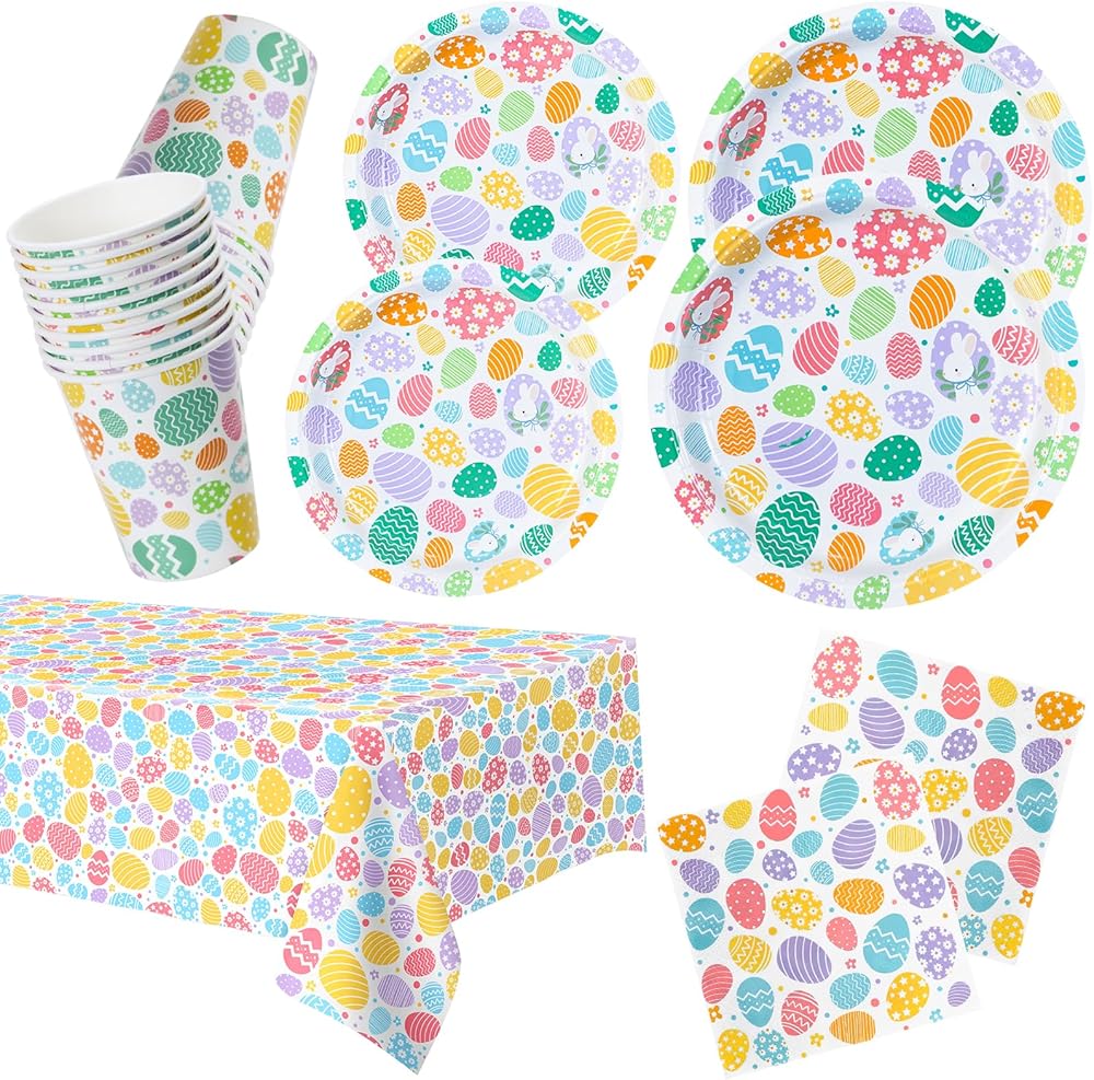• 101 Count Party Dinnerware Set Disposable for Easter Includes: 25 Dessert Plates, 25 Dinner Plates, 25 Paper Napkins, 25 Paper Cups, 1 Tablecloths.