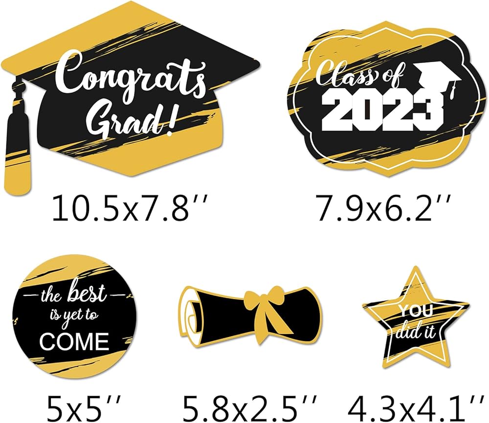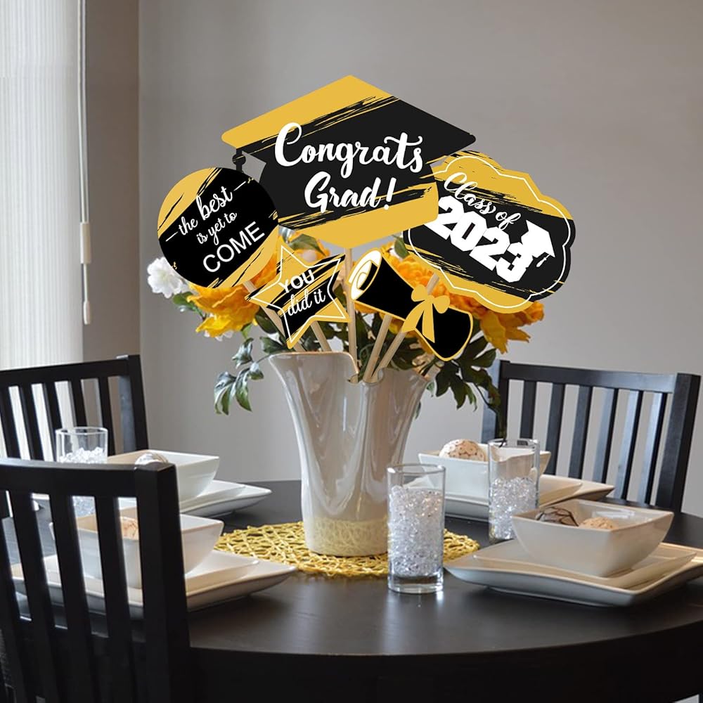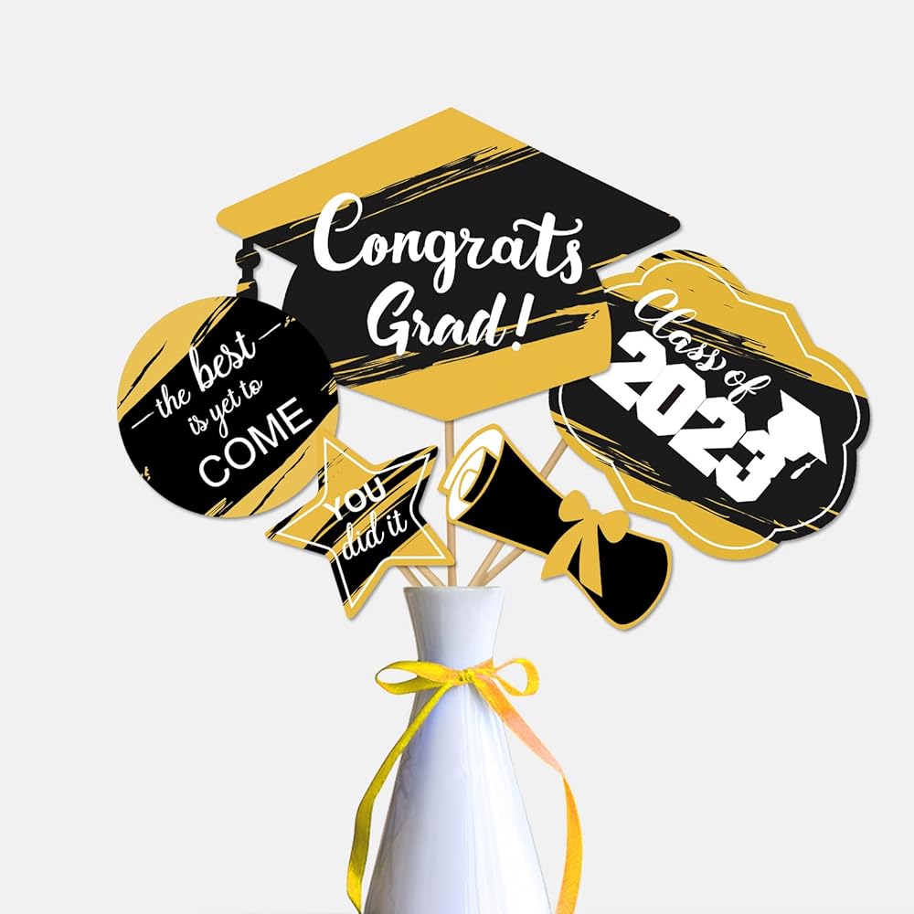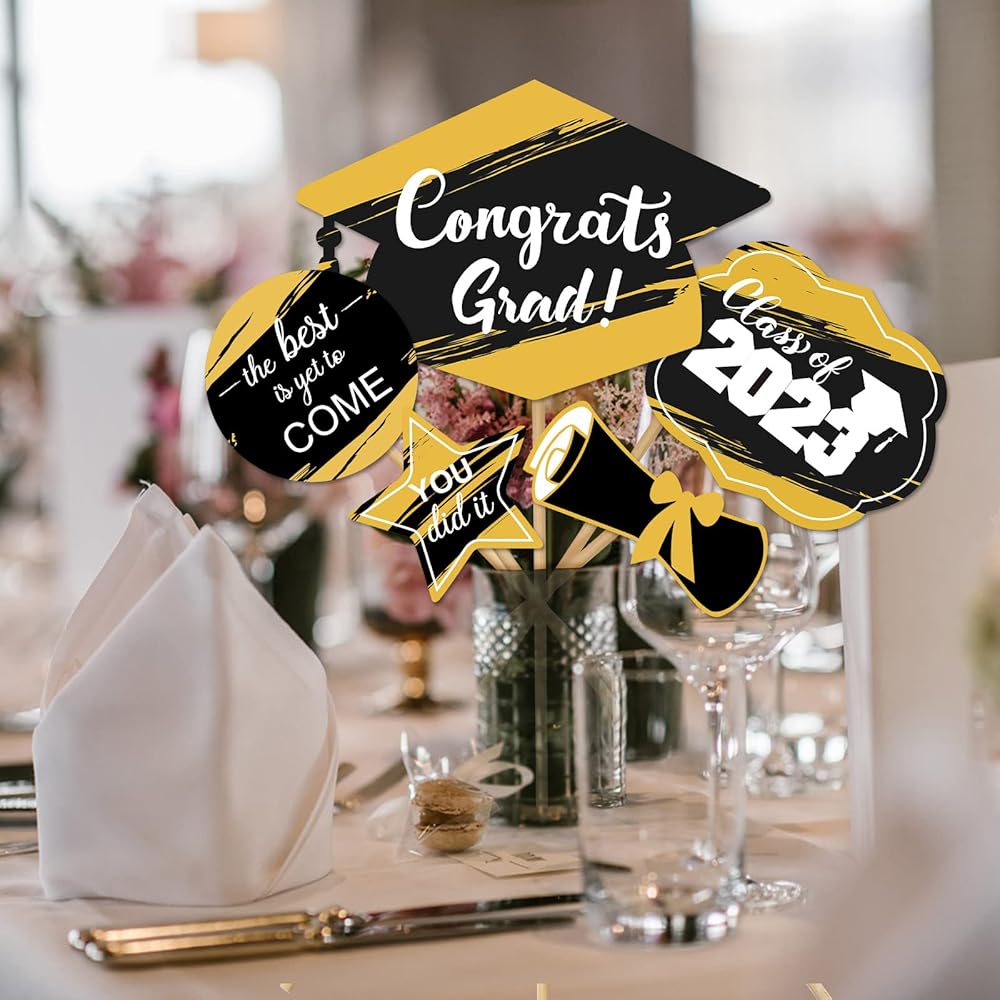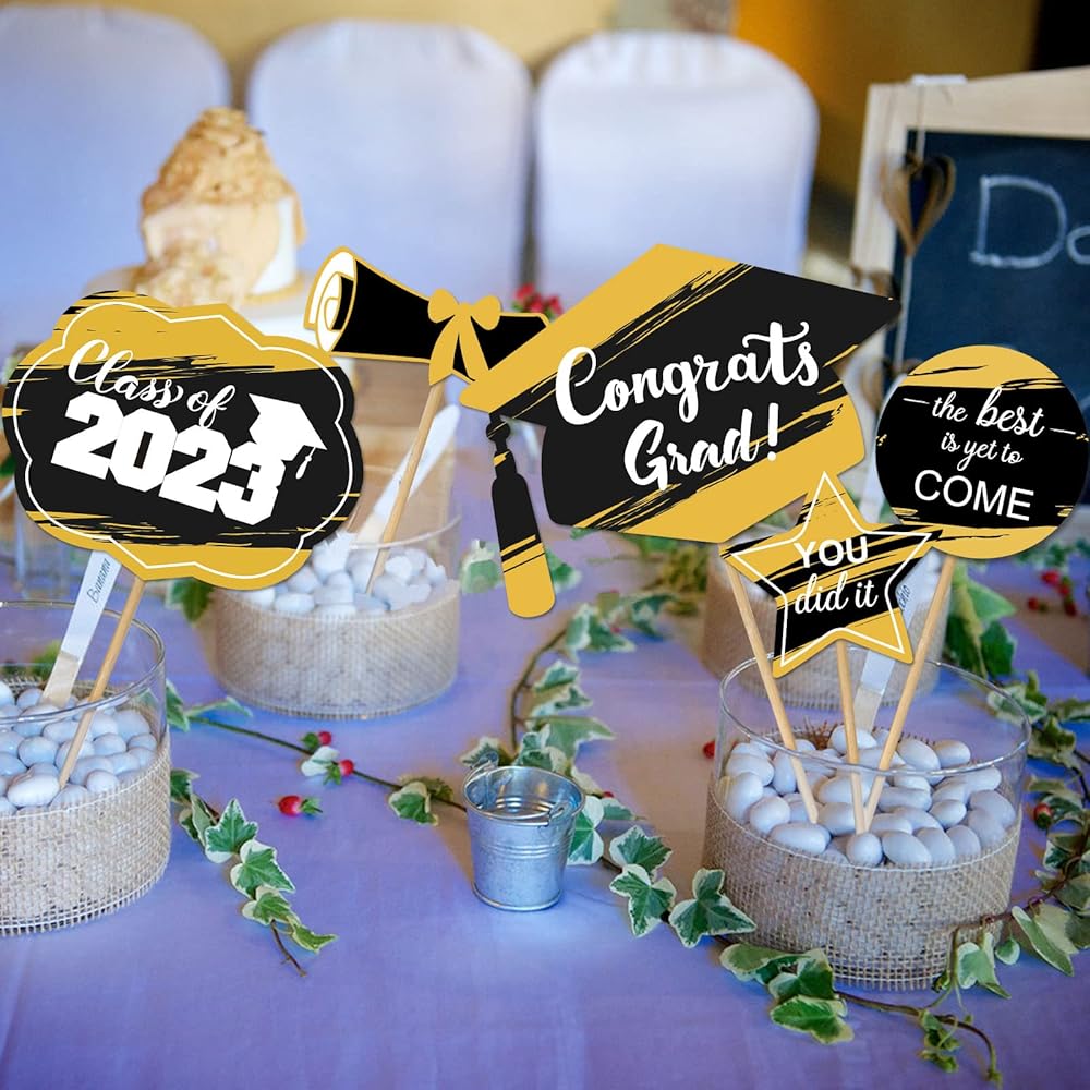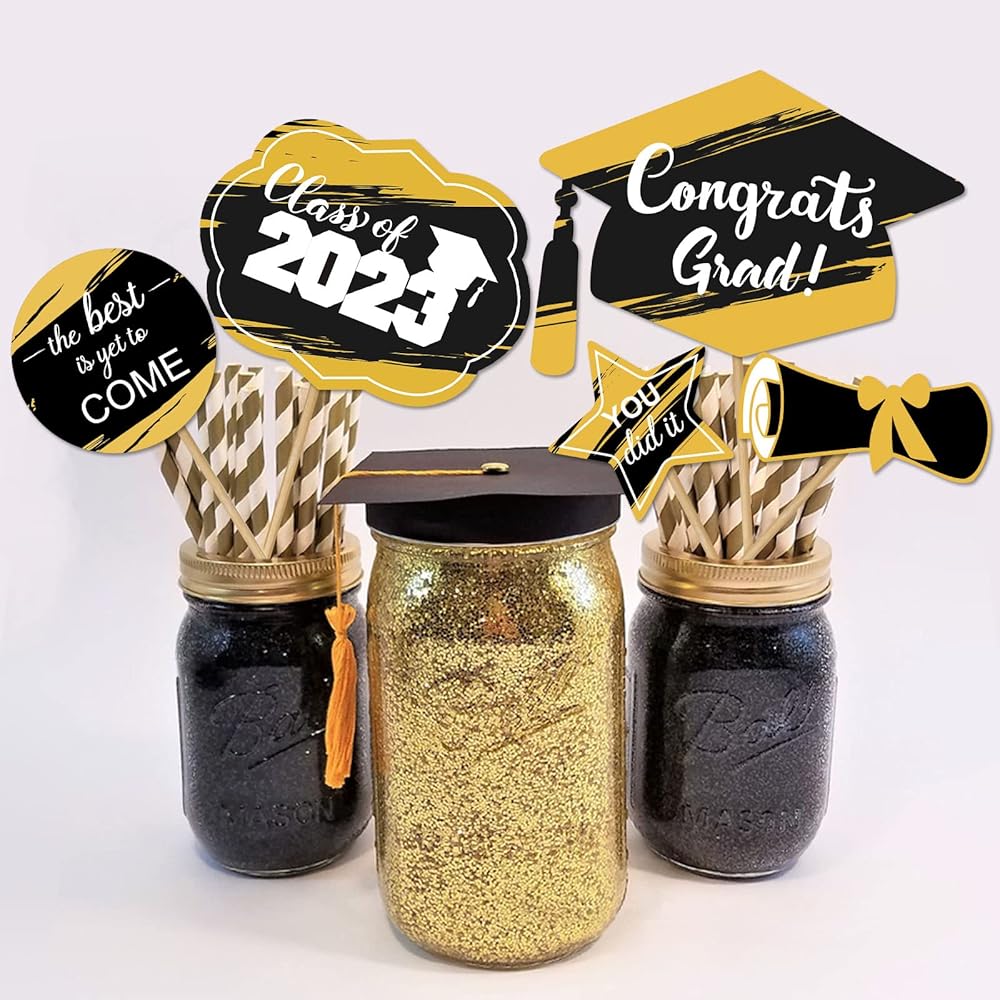 Black & Gold Grad: تشمل العصي المركزية 30 قطعة مجموعة ، وعصي بلاستيكية 30 ٪ وملصقات لسهولة التجميع. ديكور طاولة الحفلات الأسود والذهبي مثالي للصف من 2023 حفلة.