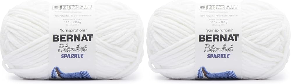 Introducing Bernat Blanket Sparkle, a new sparkling yarn in the Bernat Blanket family. The same as the original Bernat Blanket, now with a fun added shimmer! Mix and match Bernat Blanket Sparkle easily with other Bernat Blanket shades or use it on its own to create entire shimmering projects and accents for your home! Weight Category: 6. Content: 100% Polyester. Put up: 10.5oz/300g, 220yd. Gauge: 8st x 13r = 4in/10cm on size US11/8mm knitting needles. Suggested crochet hook size: US11/8mm. Dyelotted: we try but are not always able to match dyelots. Available in a variety of colors. Each sold separately. Machine Wash Cold, Do Not Bleach, Tumble Dry Low Heat, Delicate/Gentle Cycle, Do Not Iron, Do Not Dry Clean. Imported.