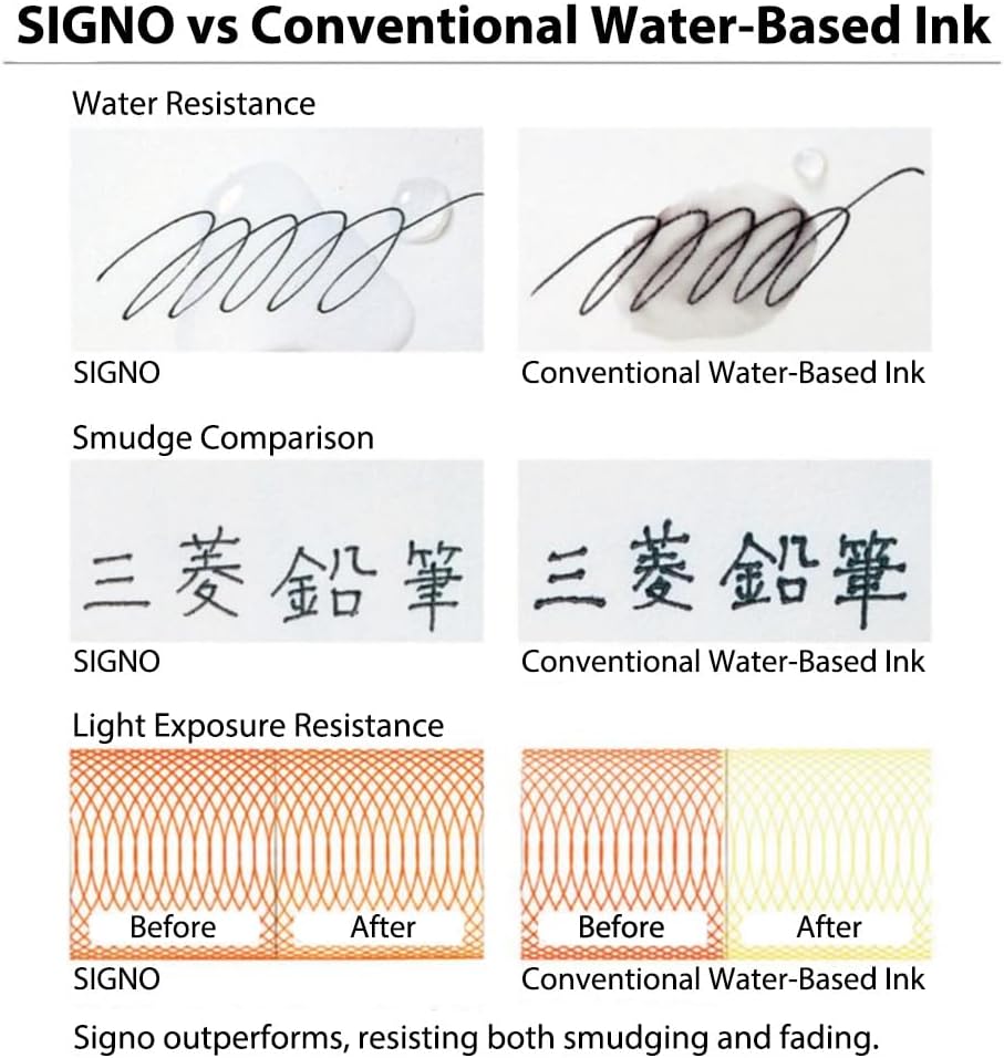 The Uni-Ball Signo Standard gel ink ballpoint pen delivers a superior writing experience, blending smoothness, precision, and durability. With advanced pigment-based ink, these fine-tip pens produce vibrant, smudge-free lines that resist water and fading over time. The ink transforms into a low-viscosity liquid as the ball rotates, enabling effortless, fluid writing. Once it dries on paper, the ink returns to its gel state, solidifying quickly to prevent smudging.