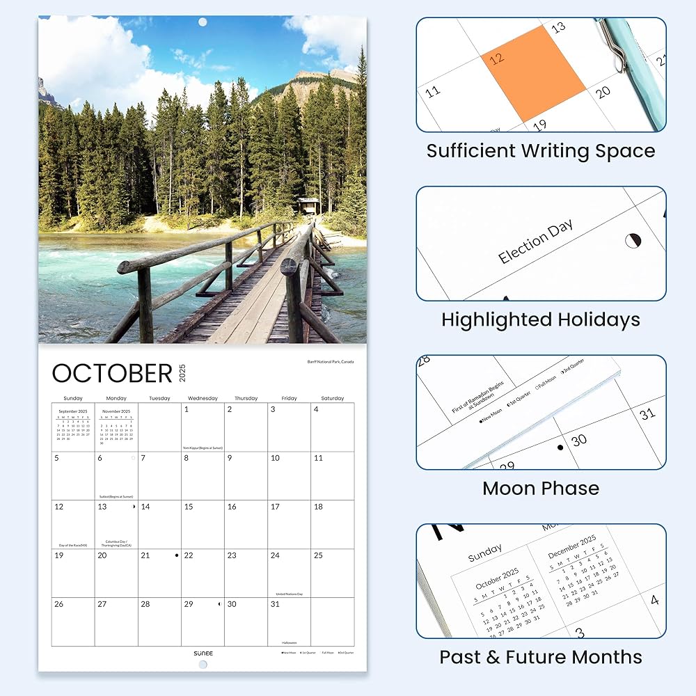تقويم الجدار 12 × 12: يحتوي تقويم الصورة على حجم مطوي يبلغ 12 × 12 بوصة وحجم عرض 12 × 24 بوصة. يحتوي تقويم الحائط 2025 على مربعات فارغة للتخطيط اليومي ويقيس 1.6 × 1.8 بوصة ، مع مساحة كافية للتسجيل. يتضمن تقويم 2025 العديد من الإجازات مثل الإجازات الفيدرالية ، والأعياد الكندية والمكسيكية ، والعديد من أيام العطل الدينية
