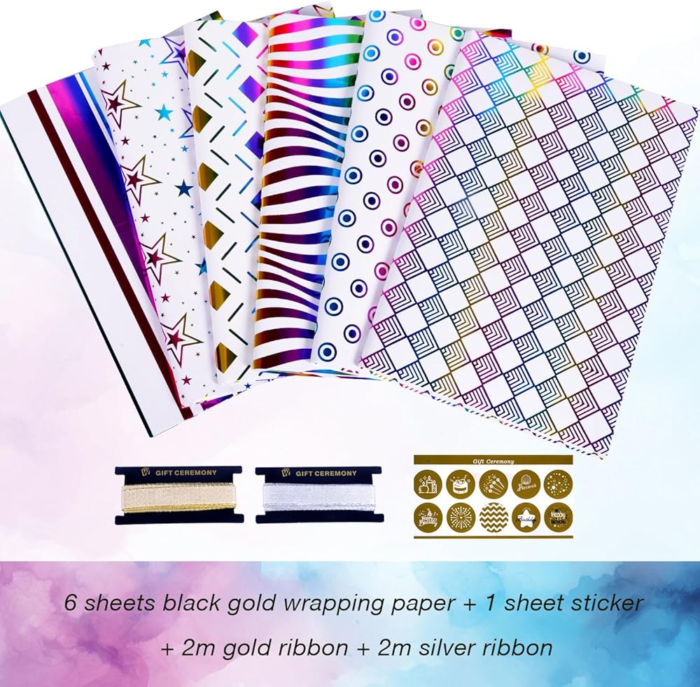 مجموعة ورق الذهب السوداء: حزمة تشمل 6 أوراق ورق التغليف الهدايا + ملصق الذهب (10 أجهزة كمبيوتر) + 1 لفة من الشريط الذهبي (2M) + 1 لفة من الشريط الفضي (2M) ، 6 تصميمات مختلفة من أوراق التغليف مع مجموعة متنوعة من الملحقات لمشروع التغليف هدية.