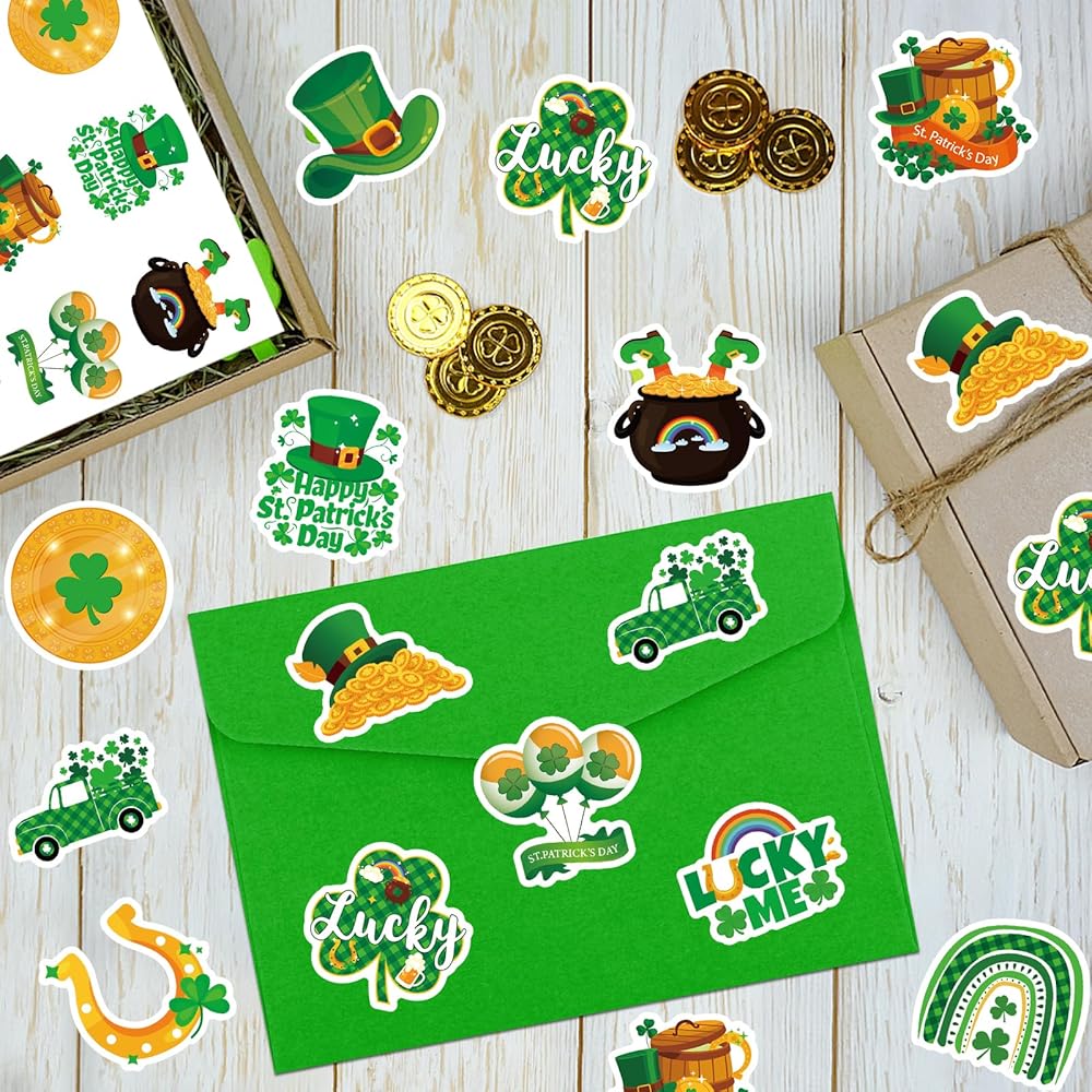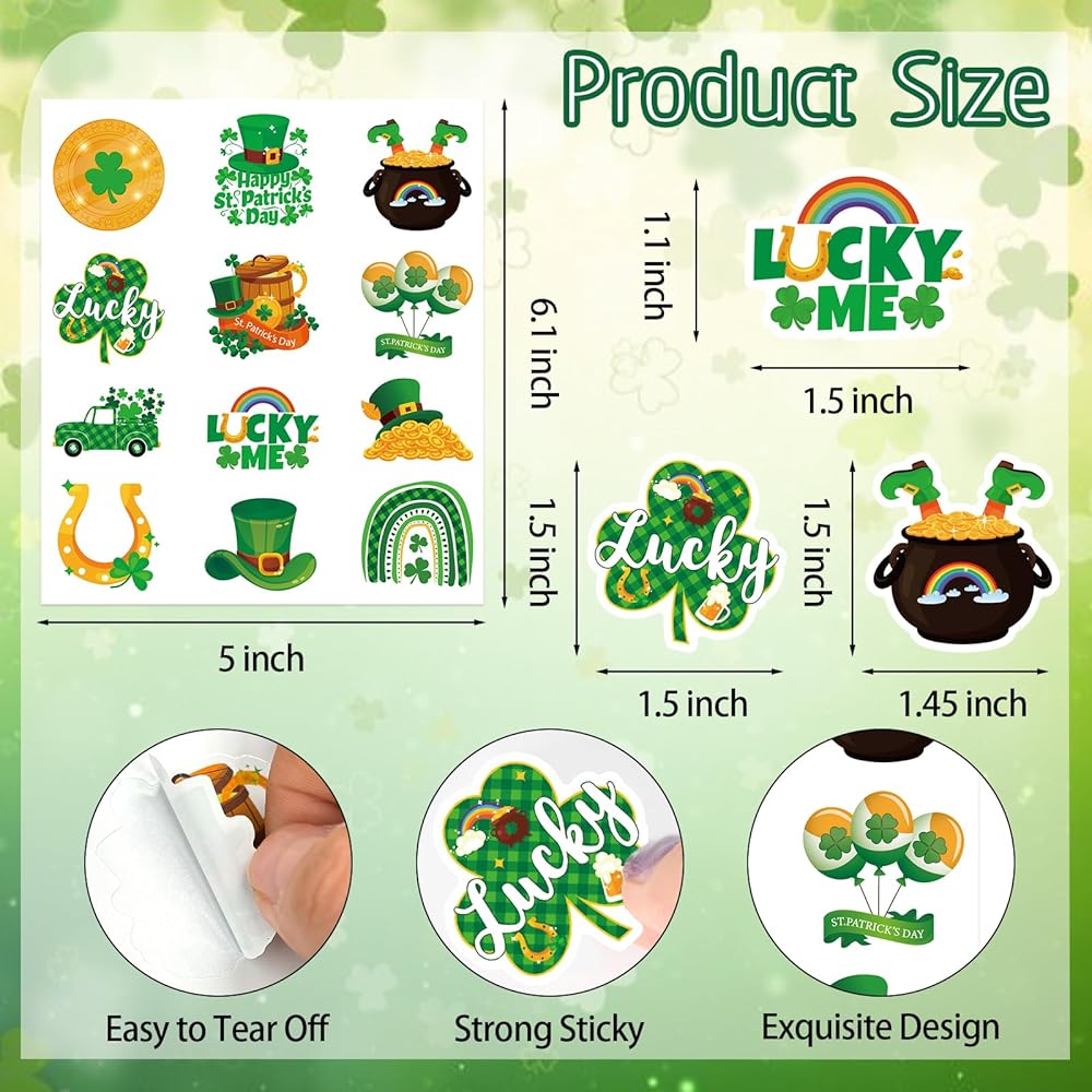 • Wide Application:shamrock clover self-adhesive sticker decals are ideal for St. Patrick's Day parties, Irish parties, homes, offices, classrooms and other decorations. St patty's day stickers are suitable for decorating cakes, boxes, envelope seals, goodie bags, scrapbooks, laptops, greeting cards, crafts, and more, adding a splash of color to them.