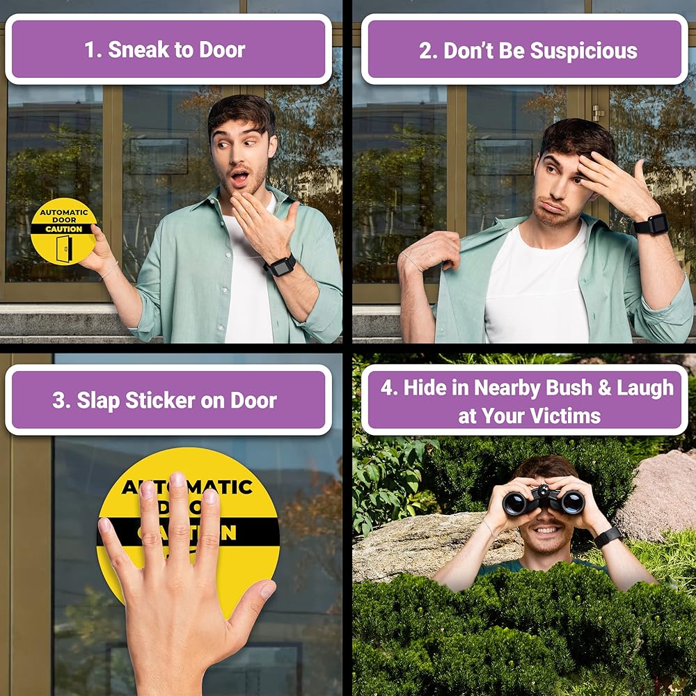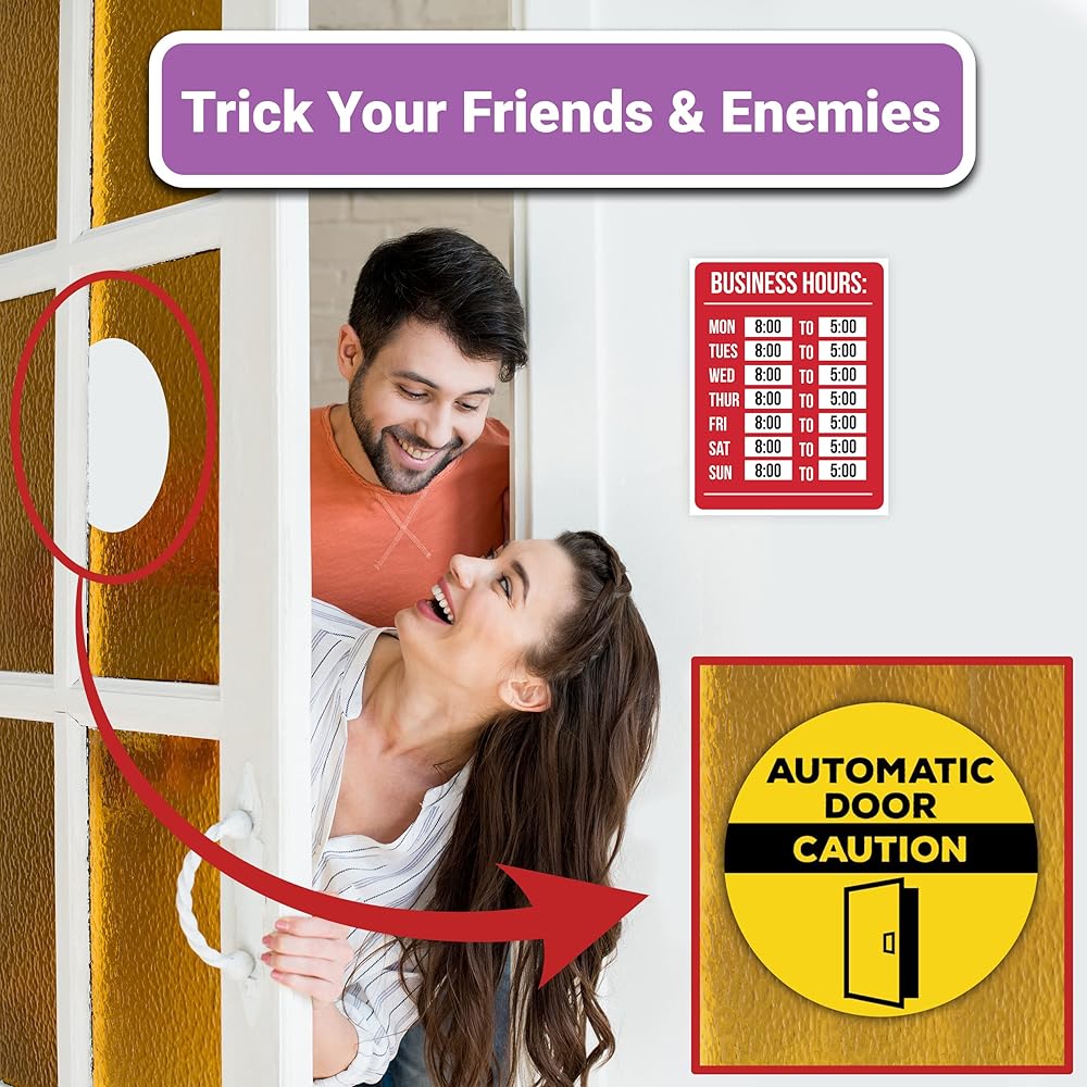 If you're looking for the perfect prank that no one will suspect, then look no further! These glossy door decals appear so professional and genuine, no one will doubt them. Our big, 5-inch decals with graphic door-opening directions will have men, women, teens and kids of all ages frantically waving their arms in the air trying to open your door.