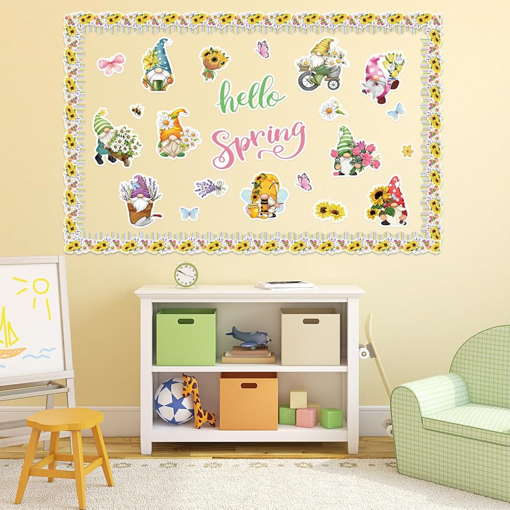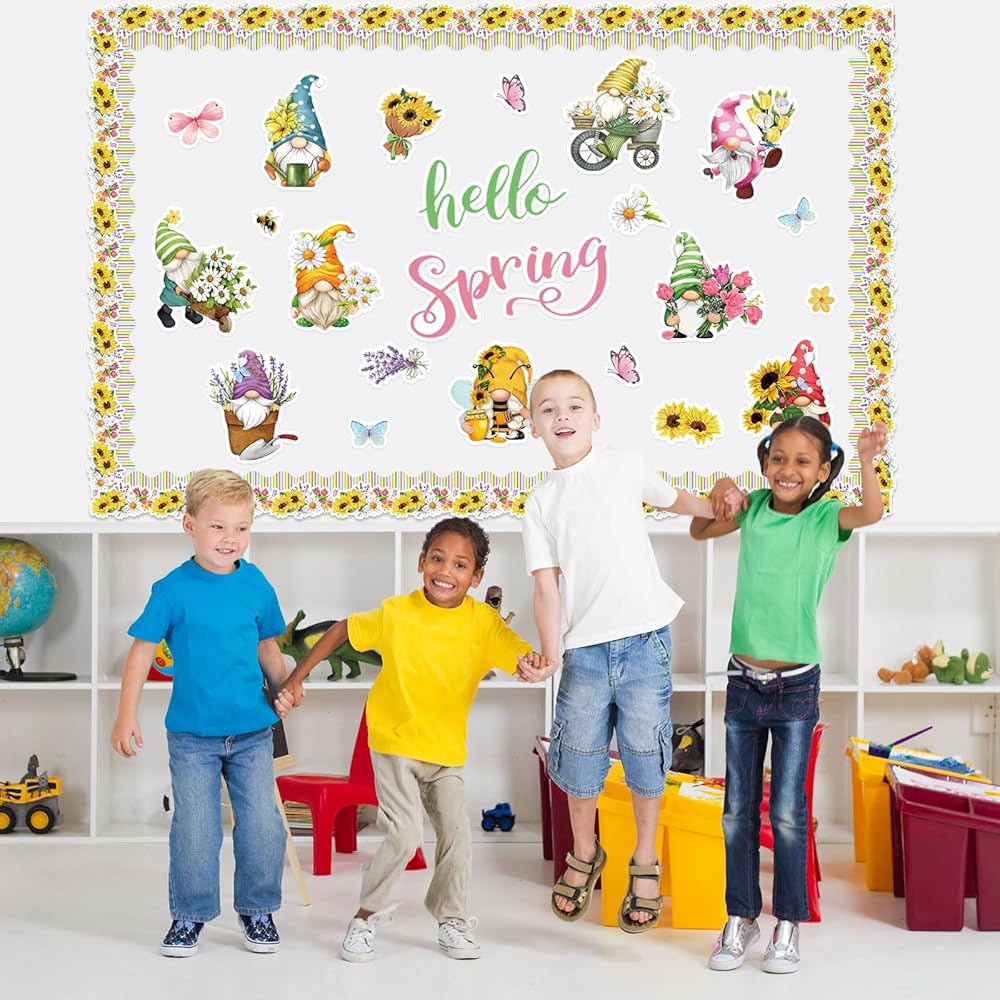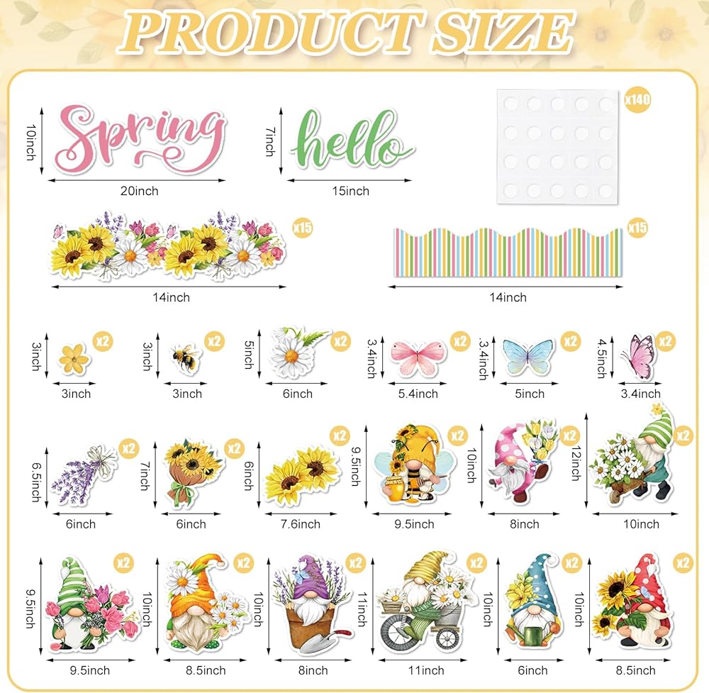 70pcs Hello Spring Bulletin Board Decoration Kit Colorful Gnome Gnome Flower Butterfly Paper Bulletin Board With With Glue Points for Spring Party Supplies