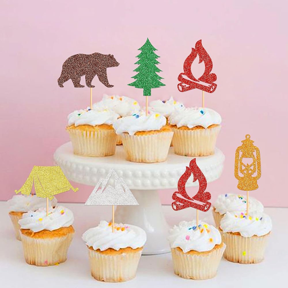 Ercadio 30 PCS Camper Themed Cupcake Toppers Tree Bear Tent Bonfire Peak Cake Picks Camper Cake Decorations for Weekend Outdoor Camper Lumberjack Theme Birthday Party Supplies