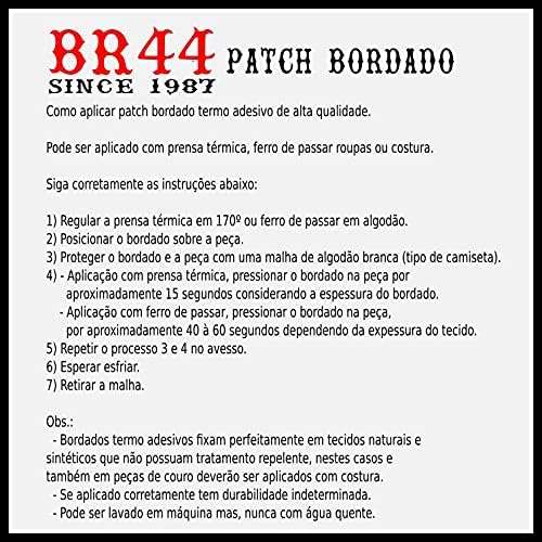 Instructions to attach patches high quality adhesives term. It can be applied with thermal press, iron clothes or sewing. Carefully follow the instructions below: 1) Set the thermal press at 170 ° iron or cotton. 2) Place the embroidery on the workpiece. 3) Protecting the embroidery and the part with a white cotton fabric (shirt type). 4) - Application to thermal press, press the embroidery piece by approximately 15 seconds whereas the thickness of the embroidery. - Implementation with iron, press the embroidery in the piece, for about 40 to 60 seconds depending on the thickness of the fabric. 5) Repeat the procedure 3 and 4 in reverse. 6) Wait cool. 7) Remove the fabric. Obs .: - Embroidered term fix adhesives perfectly natural fabrics and synthetics that do not have repellent treatment in these cases and also in leather pieces must be fixed with stitching. - If properly applied an indefinite durability. - Can be washed in machine but never with hot water.