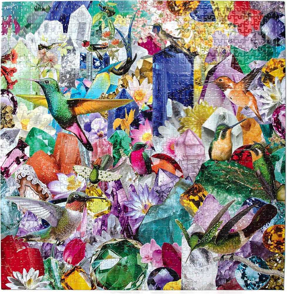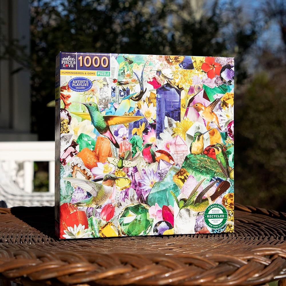 EEBOO: قطعة من الطيور الطنانة والأحجار الكريمة 1000 قطعة مربعة مربعة للبالغين ، 23 "× 23" عند الانتهاء ، قطع ألغاز قوية ، للأعمار 14 وما فوق