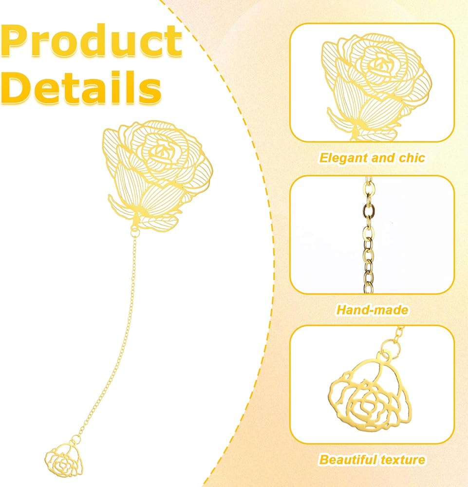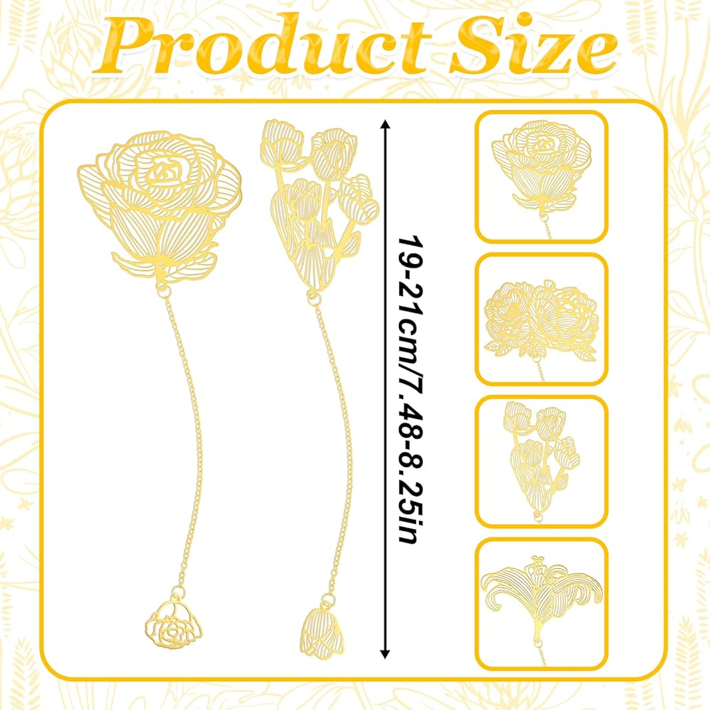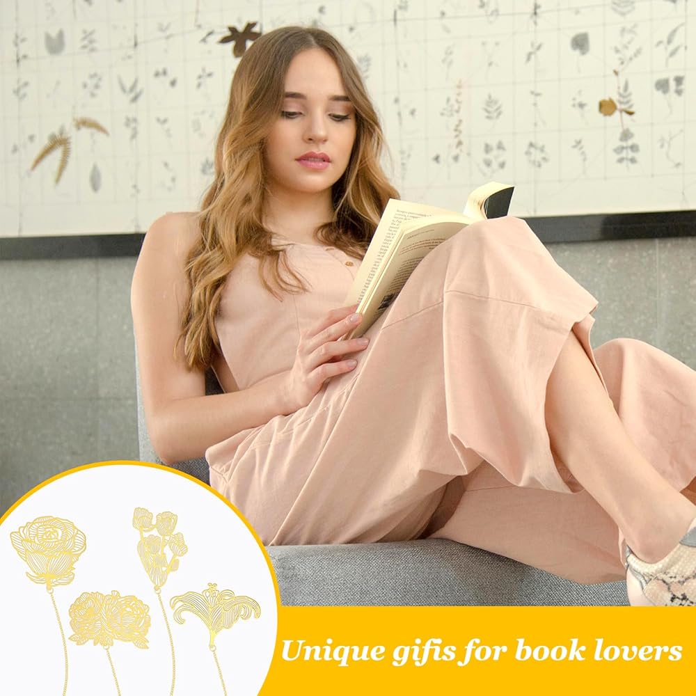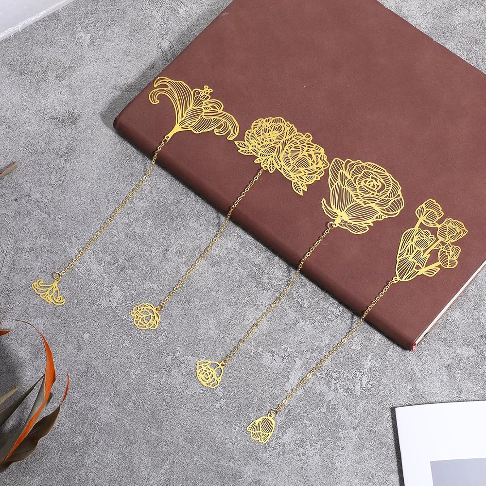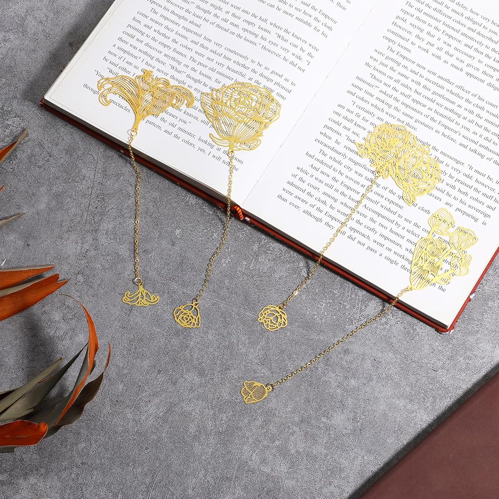 Unique Design: Each gold bookmark has a beautiful floral design that adds a touch of sophistication to your reading. The set includes 4 different styles of bookmarks, each with a unique chain to suit your preference.
