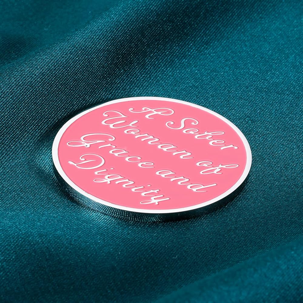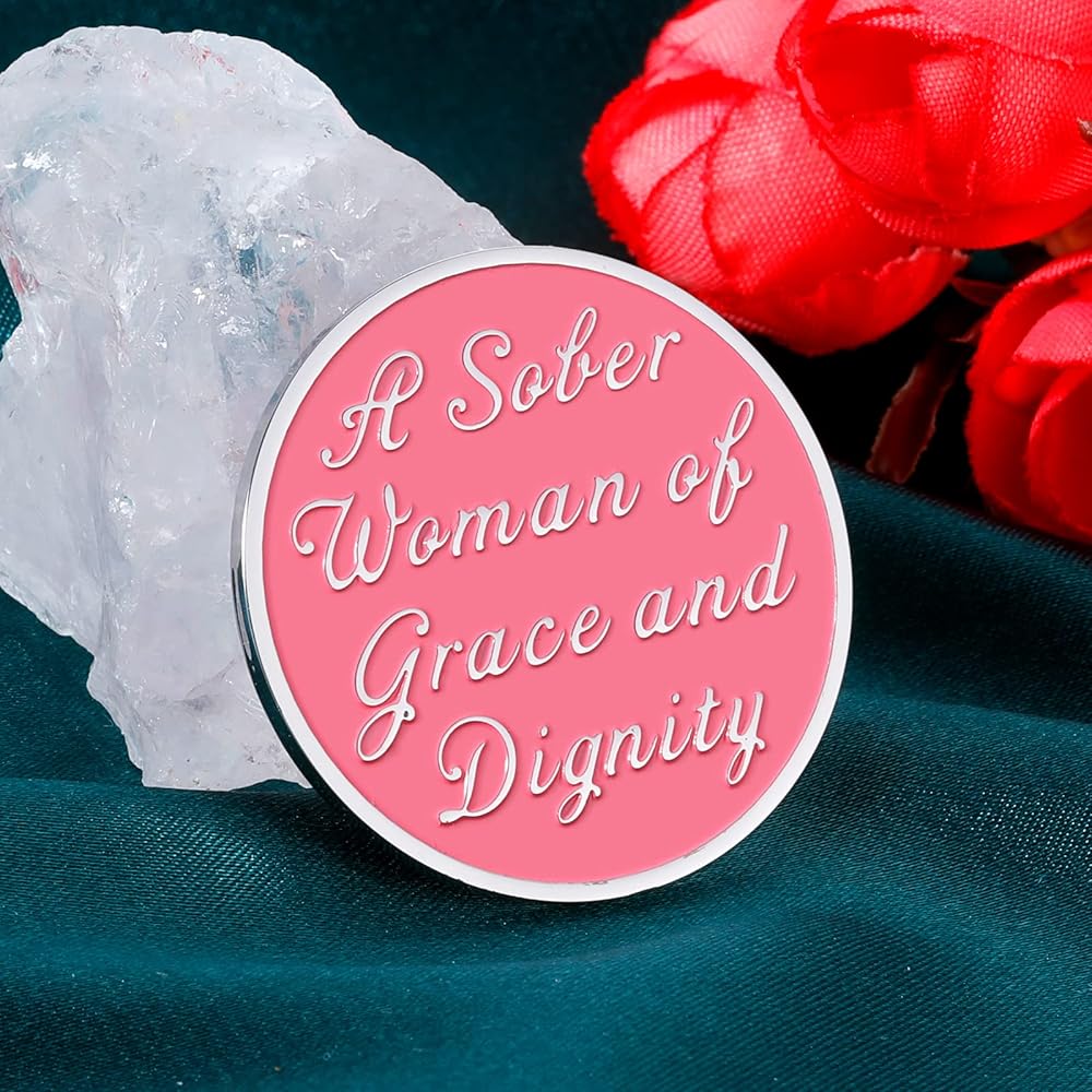 • 1 Year Sobriety Coin Gifts for Women: The front of this sobriety coin shows a woman's face and long hair flowing to wrap around a pink circle with the sobriety anniversary year number inside. The back engraves with inspirational words “a sober woman of grace and dignity” in elegant script. This sober woman sobriety chip will be a wonderful recovery gift for women to celebrate recovery and commemorate 365 days of sobriety.