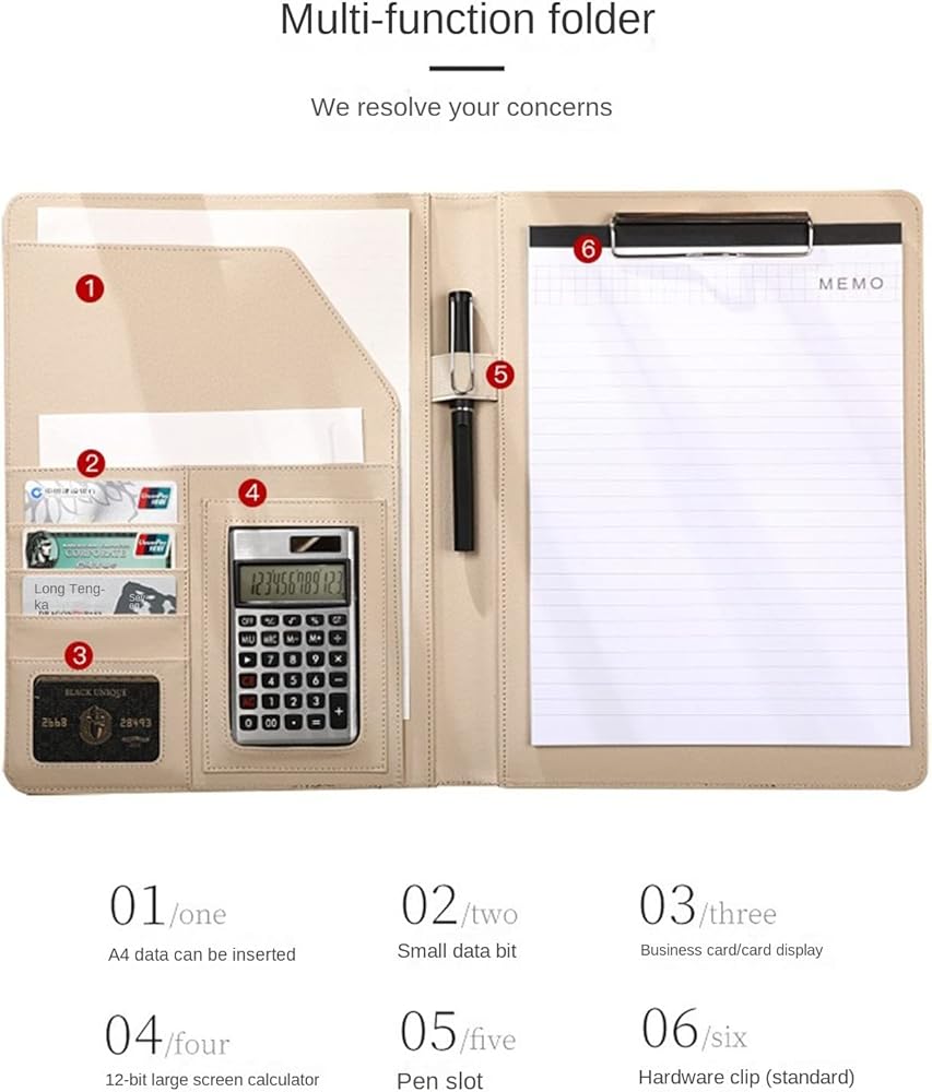 【تخزين متعدد】يمكن أن يستوعب حجم حافظة لوحة المشبك ورق بحجم A4 وحجم الحروف، ويمكنه بسهولة حمل لوحات مشبك مقاس 8.5 × 11 بوصة، وجيوب تخزين متعددة مدمجة، بما في ذلك الحافظة، وجيب ورق A4، و4 فتحات للبطاقات، وجيب الآلة الحاسبة، حامل أقلام وجيب صغير، مثالي للاستخدام اليومي وسفر العمل