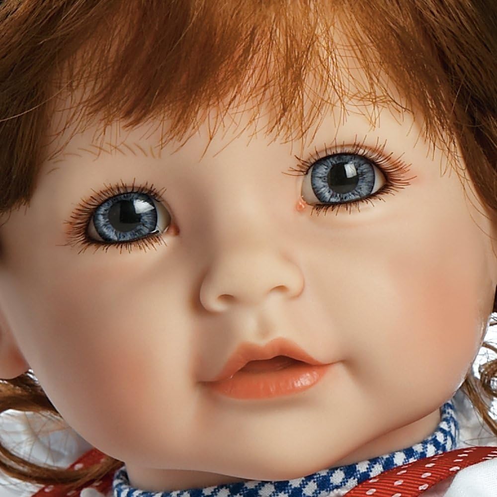 REALISTIC DETAILS - Her blue eyes are outlined by lifelike, hand-applied eyelashes, plus her mouth is slightly opened. She has a hand-painted face, reddish auburn doll hair, and a light skin tone, and her bean-bag weighted body gives her that cuddly, lifelike feel