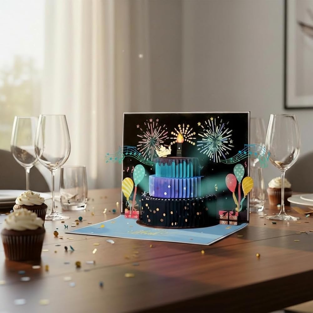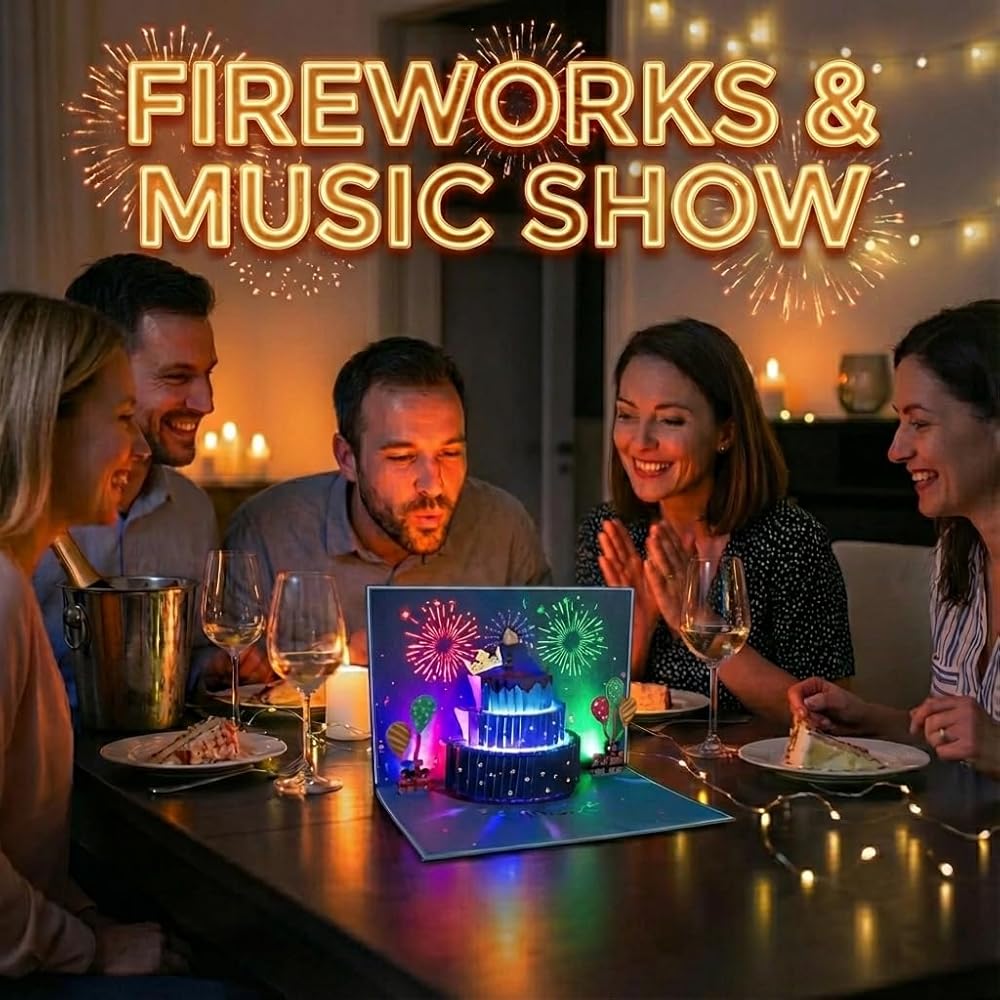 الألعاب النارية واللحن المذهلة: يفتح فتح البطاقة عن عرض ألعاب نارية نابضة بالحياة متزامنة مع لحن عيد ميلاد سعيد مبهج - وضع نغمة الاحتفال الذي لا ينسى.