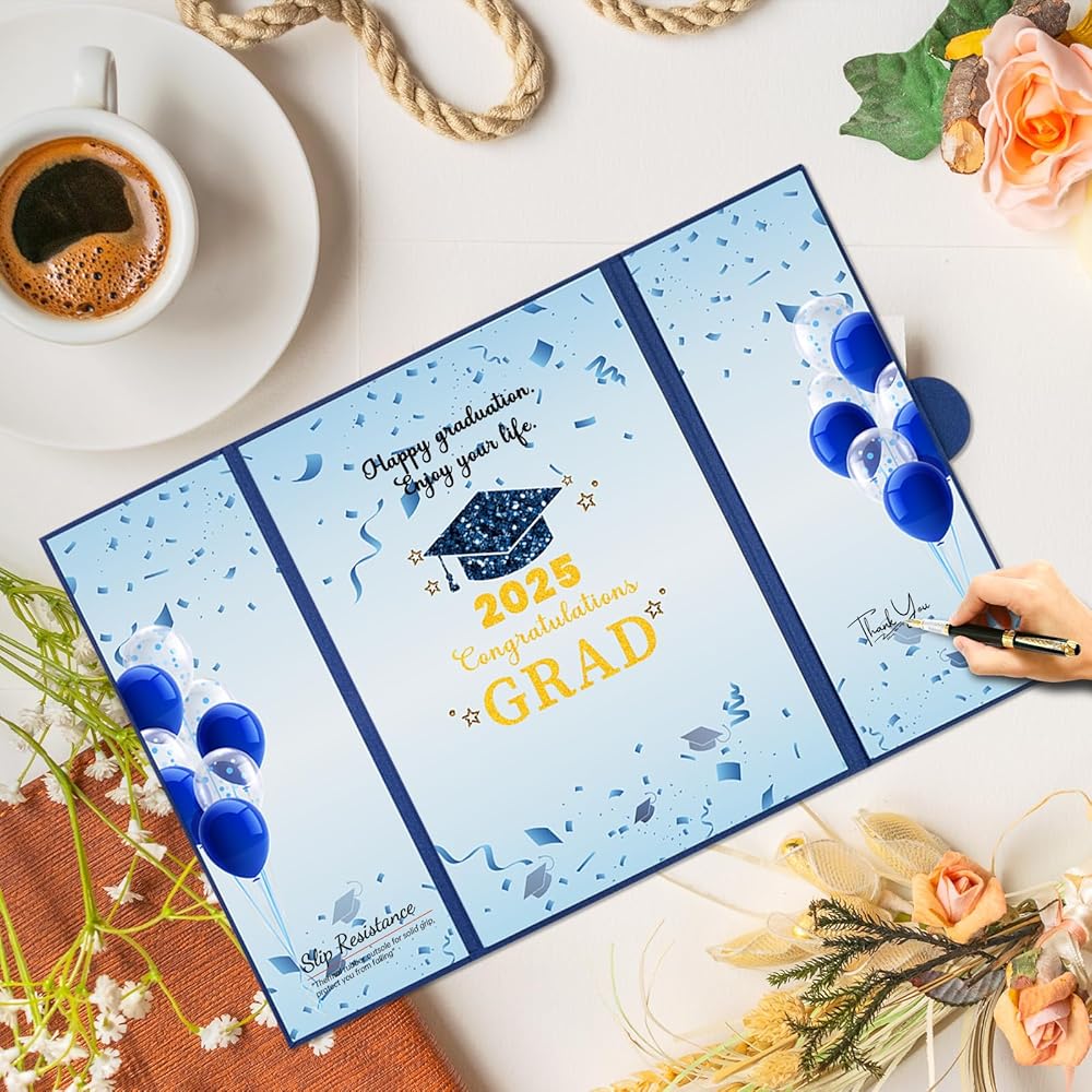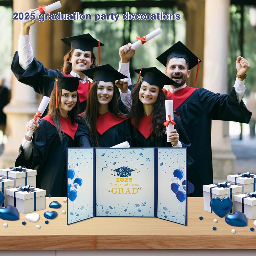 2025 التصميم الذي يحمل عنوان التخرج: التقاط روح معلم الخاص بك من خلال كتاب الضيوف الأنيق 2025 ، والذي يضم لهجات "فئة 2025" الخالدة التنسيق بسلاسة مع زينة لحفلات التخرج 2025.