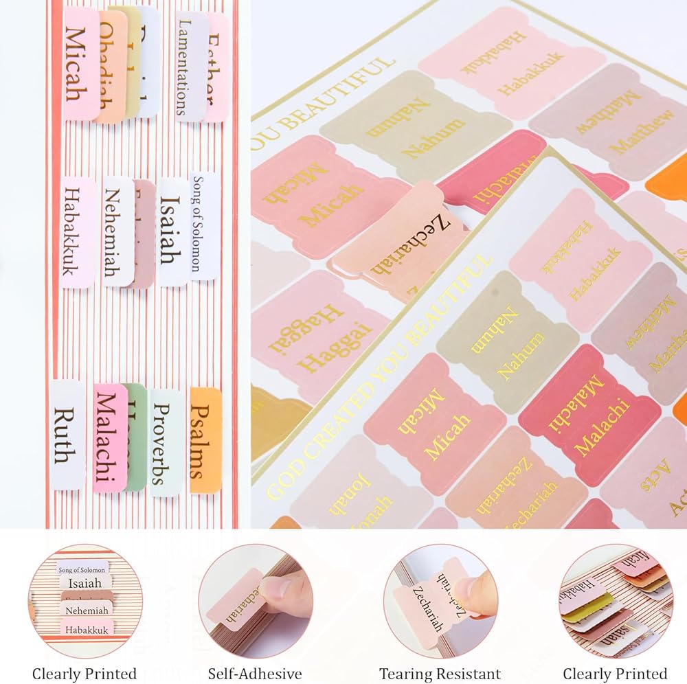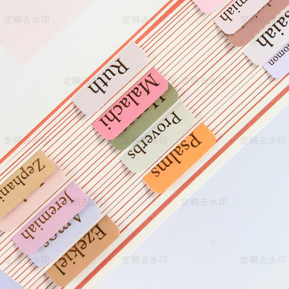 • Bible tabs are meticulously crafted from high-quality laminated materials, featuring excellent water resistance, stain resistance, and tear resistance. Even after prolonged and frequent use, they maintain their clarity and functionality, ensuring that your tabs remain as good as new.