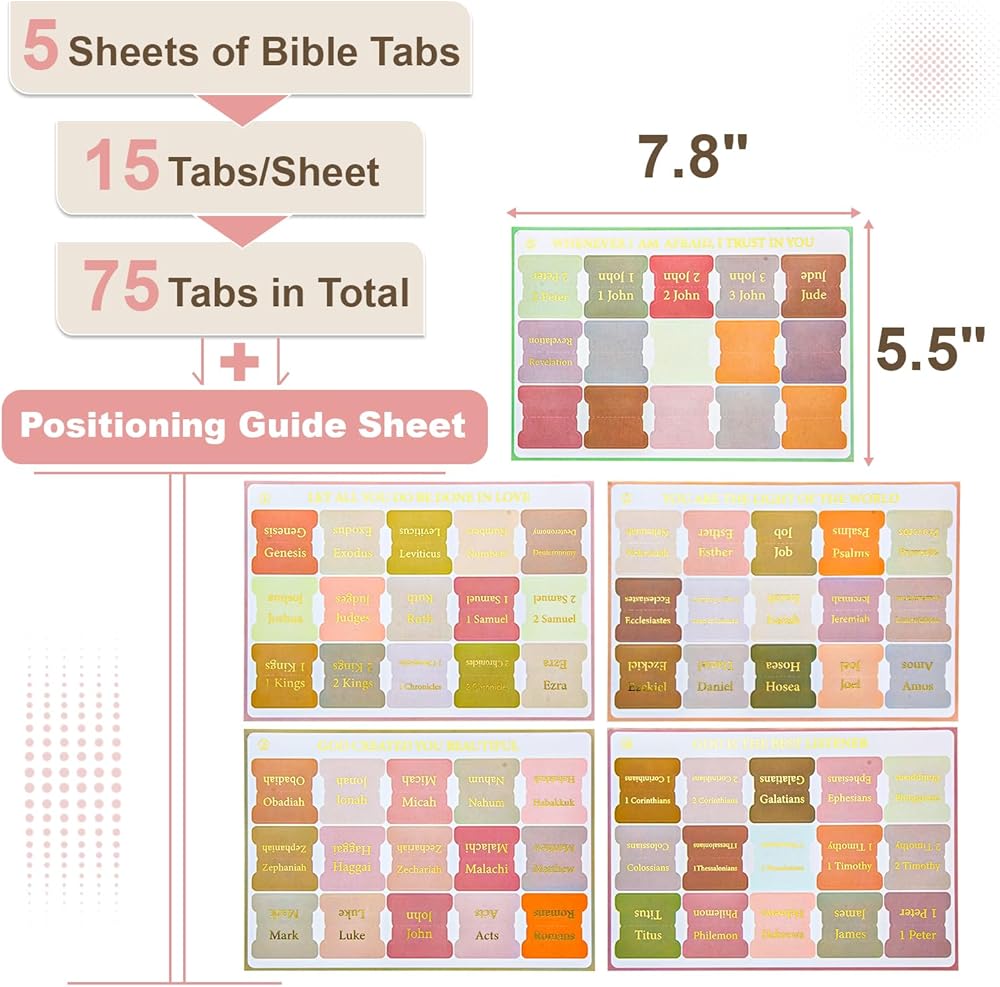 • Each bible tabs set includes 39 Old Testament tabs, 27 New Testament tabs, and 9 blank tabs.it included alignment guide and pre-cut design make the application process exceptionally simple, allowing bible tabs to be folded and pasted quickly and easily, making your Bible study more organized and efficient.