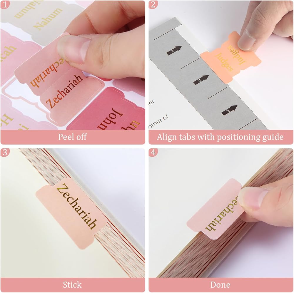 Each set of our Bible tabs comes with a complete collection: 39 Old Testament tabs, 27 New Testament tabs, and 9 blank tabs for your personal notes or bookmarks. The included alignment guide and pre-cut design make the application process a breeze. You can fold and paste the tabs quickly and easily, bringing order and efficiency to your Bible study.