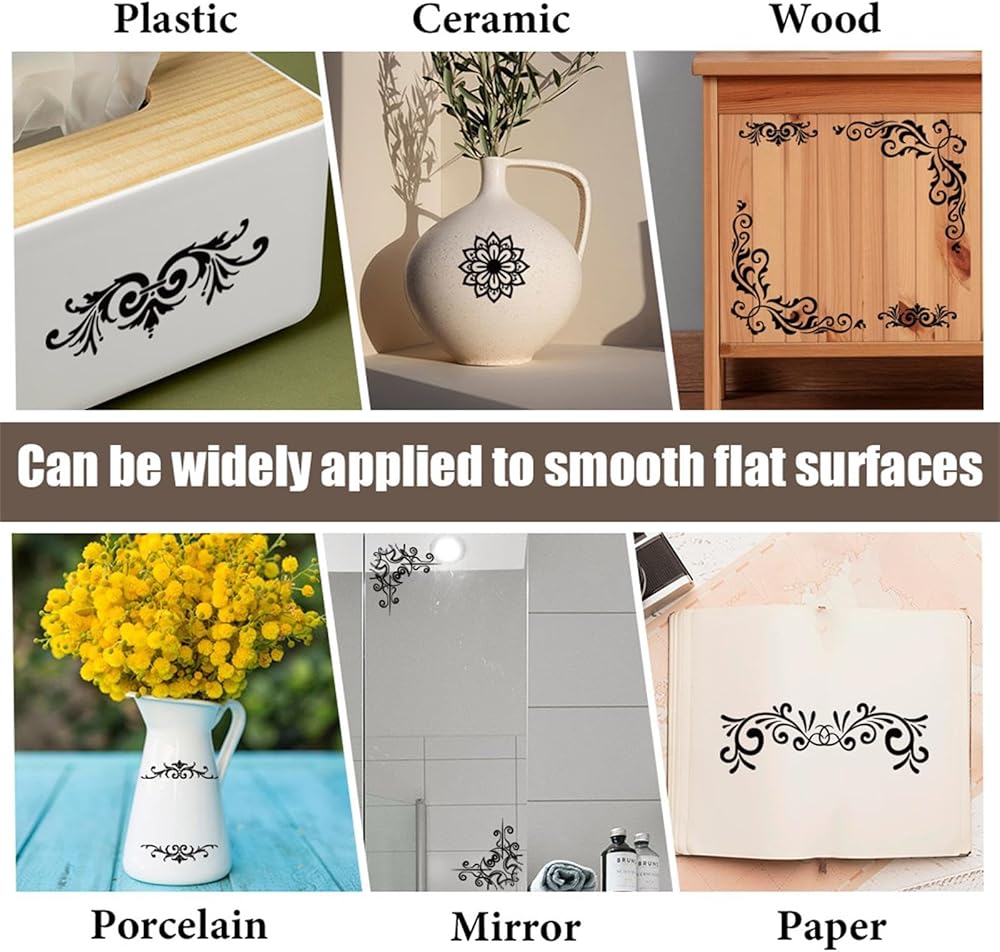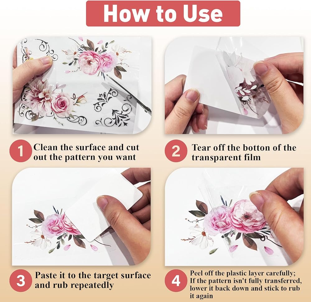 تطبيق واسع: يمكن تطبيق الاحتكاك على ملصق النقل على معظم الأسطح الناعمة مثل الزجاج والورق والقطن والجلد والخزف والمعادن والخشب ، مما يجعله مثاليًا لتزيين الأثاث والحرف اليدوية