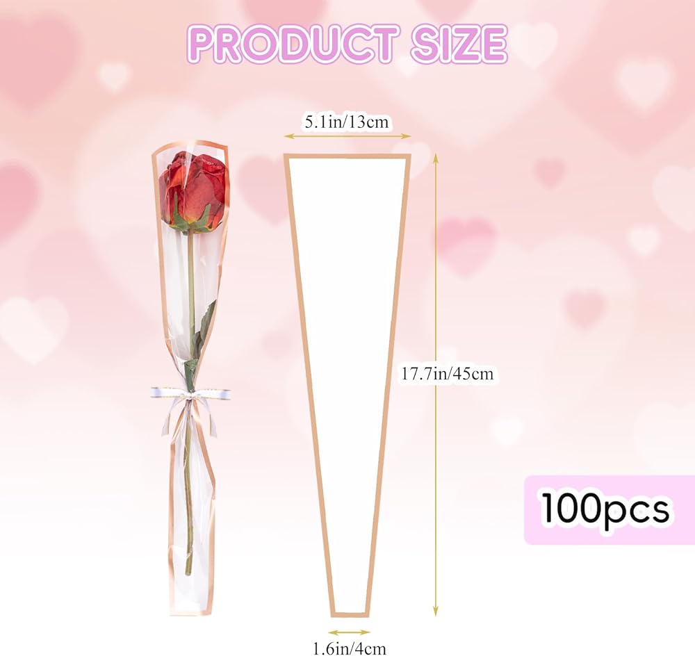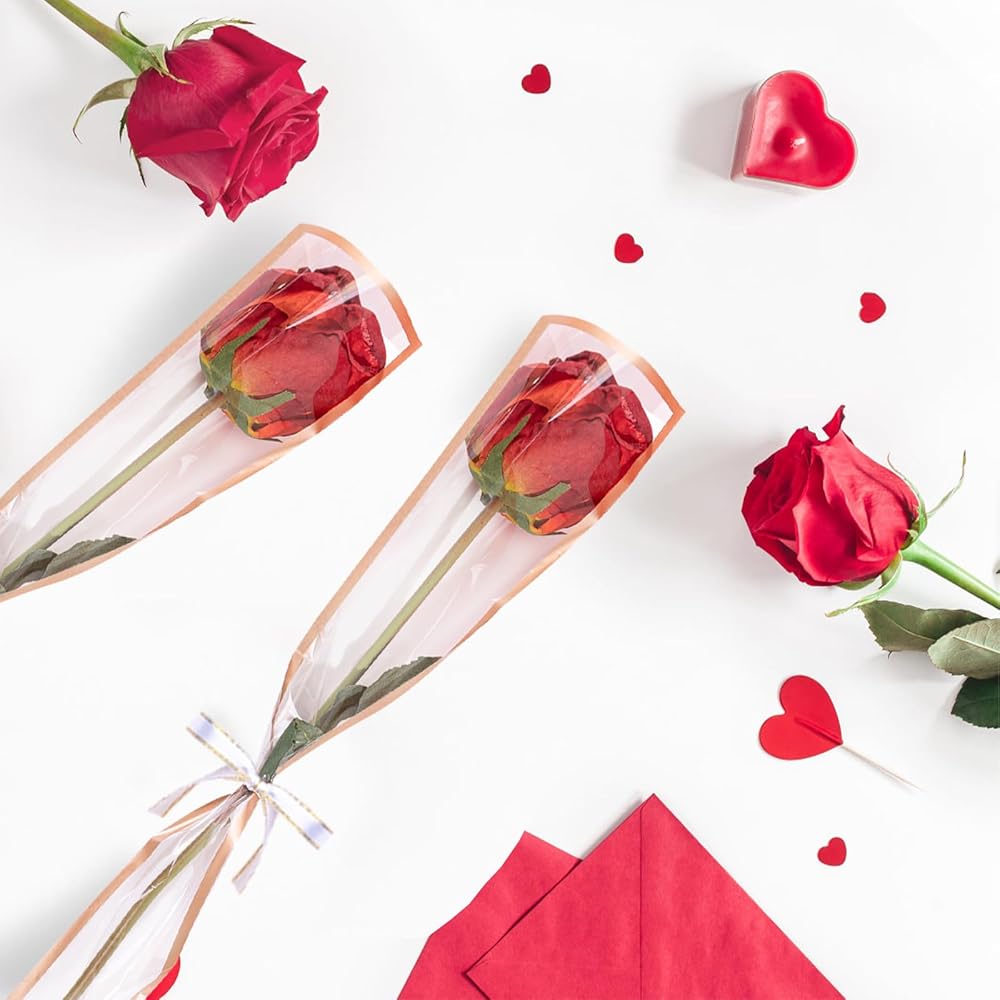 Gloreyan 100pcs Single Flower Sleeves Wrapping Bags Single Rose Florist Bouquet Packaging Bags Golden Edge Cellophane Flower Sleeves for Floral Arrangement Supply Wedding Valentine's Day