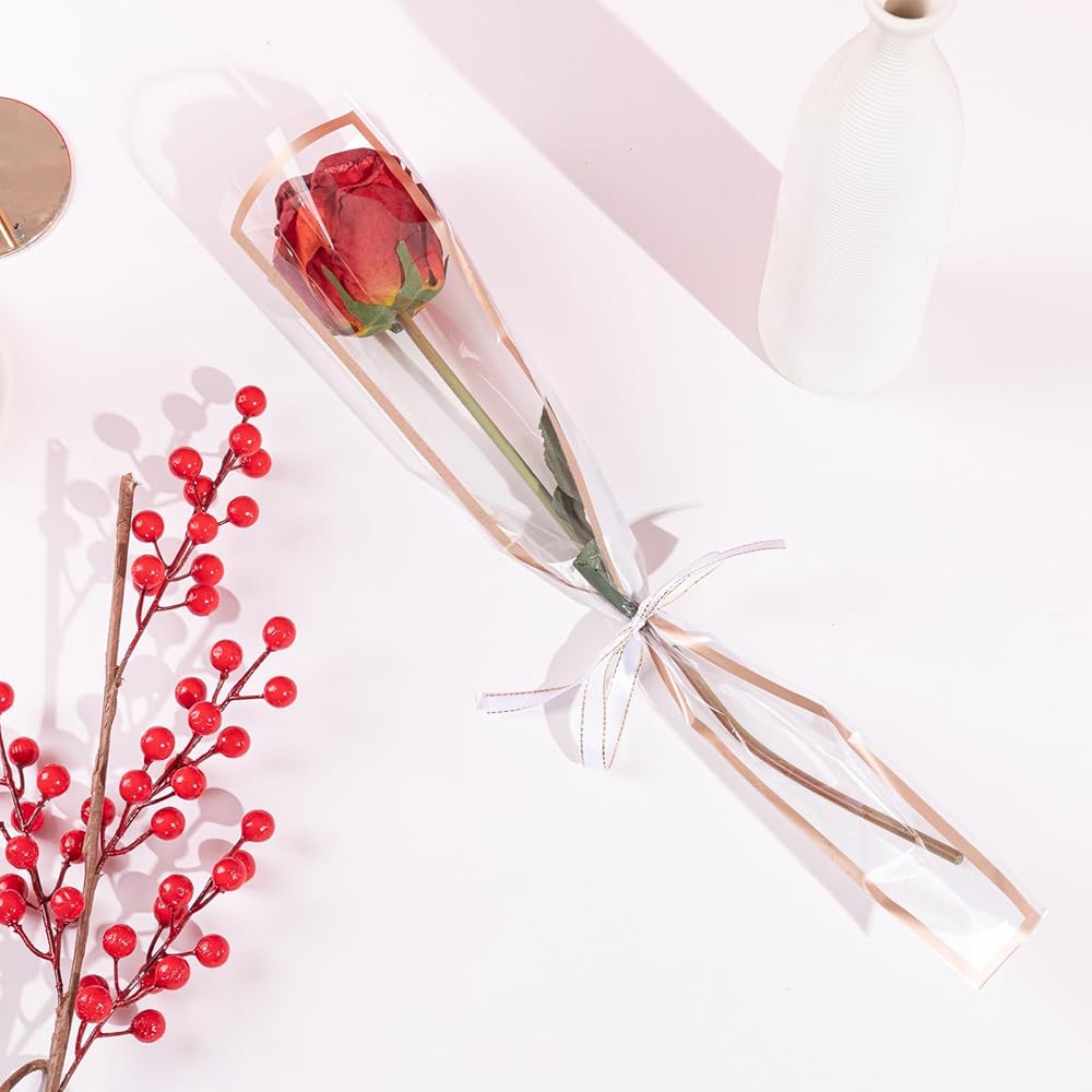 Material:The single rose flower packaging bags are made of OPP,clear,sturdy and durable.Featuring gold trim for elegant design.