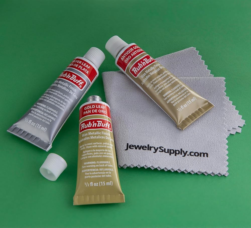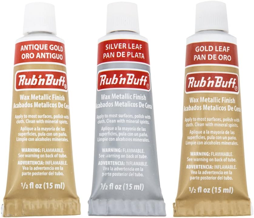 Elevate your crafting and restoration projects with our Rub-N-Buff 3 Color Assortment, now bundled with a premium microfiber buffing cloth for effortless application and clean-up. This set includes: One ½ fl oz tube of Antique Gold Rub-N-Buff One ½ fl oz tube of Silver Leaf Rub-N-Buff One ½ fl oz tube of Gold Leaf Rub-N-Buff One high-quality microfiber buffing cloth Rub-N-Buff is the perfect solution for adding metallic accents to your home decor and craft projects. This wax-metallic finish is ideal for: Restoring cherished antiques Stenciling Frame finishing Antiquing Home decor enhancement Restoration work Various craft projects Our unique formula, crafted from imported carnauba waxes, shining metallic powders, and carefully selected pigments, gives your projects the shimmer you desire. The included buffing cloth makes application a breeze – simply apply the product to your desired surface and buff it to an appealing luster. The addition of our premium microfiber buffing cloth not only aids in achieving a perfect finish but also helps keep your fingers and workspace clean during application. This versatile cloth can be used for other purposes as well, such as cleaning eyeglasses or buffing glass surfaces. Rub-N-Buff is applicable to nearly every surface, making it a must-have tool for DIY enthusiasts, crafters, and restoration professionals alike. Transform your projects with ease and achieve professional-looking results with our Rub-N-Buff 3 Color Assortment and Buffing Cloth bundle.