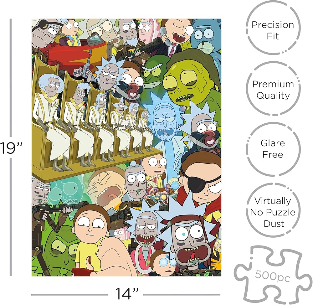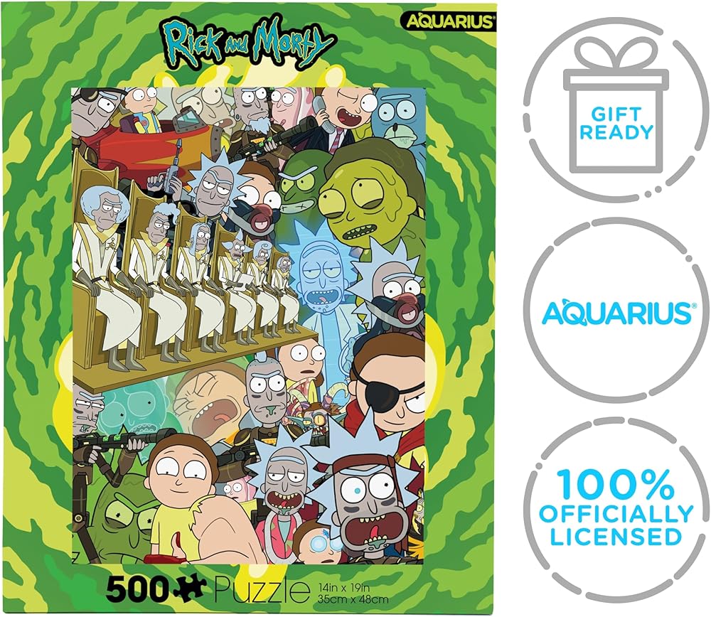 500 PIECE JIGSAW PUZZLE: Rick and Morty fans will have a blast completing this 500 piece puzzle featuring artwork from the Nickelodeon show Rick and Morty. This unique puzzle measures 14 x 19 in. LOOKING FOR RICK AND MORTY GIFTS? This Rick and Morty puzzles is the ultimate gift for Rick and Morty fans of all ages. Perfect for family puzzling, game night, birthdays, holidays, kids and adults will absolutely love receiving it as a gift. PREMIUM QUALITY YOU CAN TRUST: Our precision cutting technique ensures a perfect fit of all puzzle pieces, leaving virtually no puzzle dust behind. We use thick quality paper that is glare-free so you can show off your masterpiece with pride 100% OFFICIALLY LICENSED RICK AND MORTY MERCHANDISE: This Rick and Morty puzzle is designed by AQUARIUS, officially licensed, and 100% authentic. It's the perfect piece of Rick and Morty collectible memorabilia to add to your collection.
