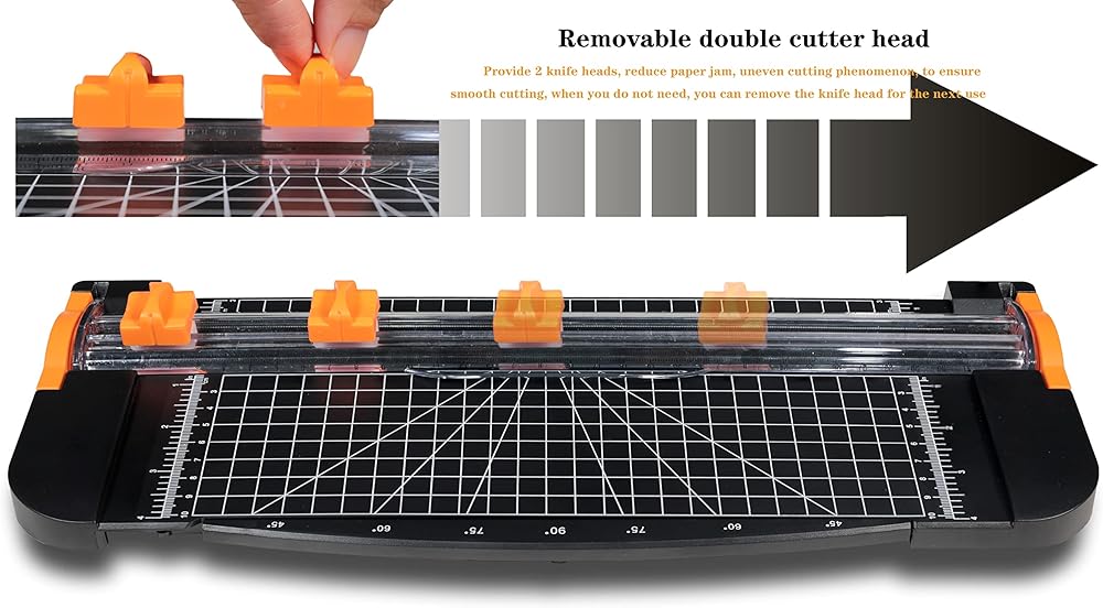 محمولة وآمنة. تعمل قطاعة الورق هذه تمامًا مثل أدوات تقطيع الورق عالية التحمل باهظة الثمن. يمكنها قص طبقتين من الورق المقوى. يتميز بمقياس ممتد، وهو مفيد أيضًا. أداة تقطيع الورق هذه خفيفة الوزن وسهلة التحريك. آمن للتشغيل. تعمل الشفرة المدمجة في الحافظة الواقية فقط عند الضغط عليها. مثالية لتجنب المخاطر أثناء النقل والاستخدام. نقدم رأسين قاطعين، إذا تم تلف هذا الرأس، يمكنك إزالته واستبداله بسهولة.