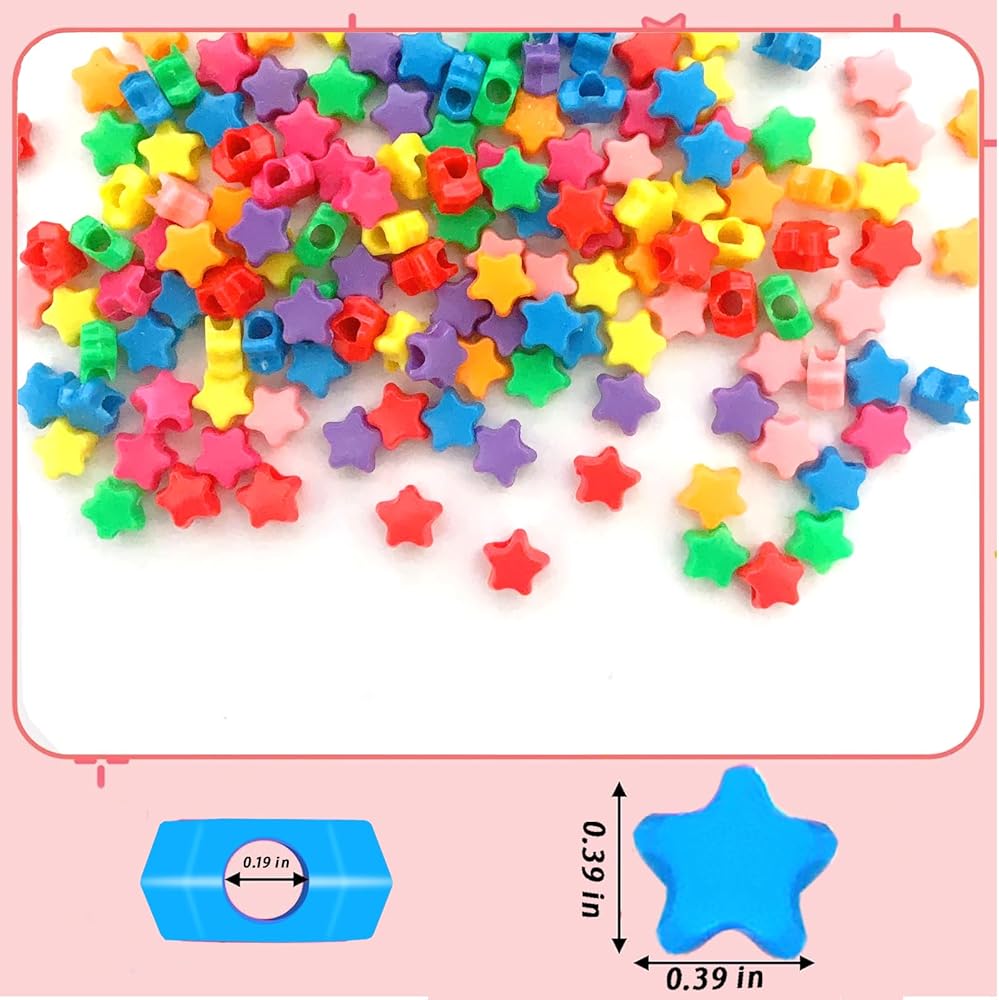 • [Size]: The size of each Star Pony Beads is about 0.24*0.36inch. Hole size is 0.16inch. Note: Small items to prevent children from swallowing and choking. Applicable age:3 years+.