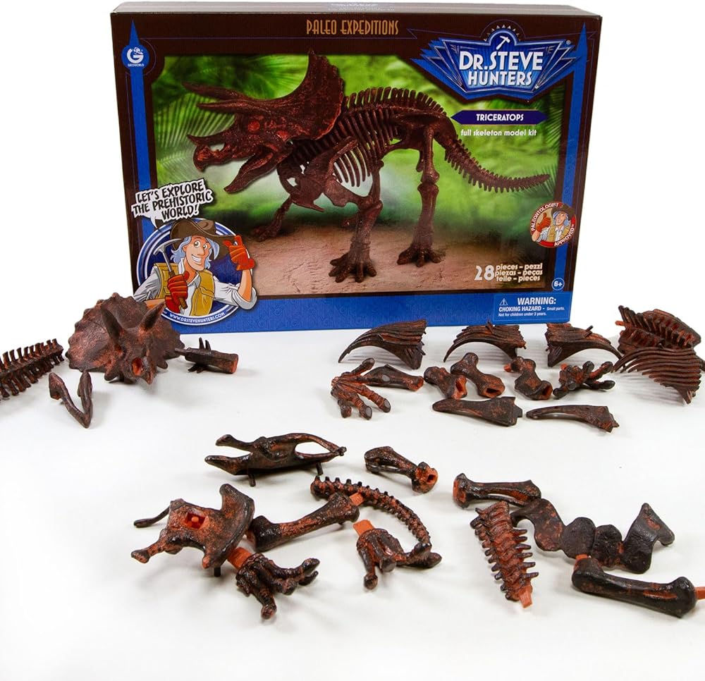 Get ready to embark on a prehistoric adventure with the Geoworld Triceratops Skeleton Model Kit! This engaging kit offers children the opportunity to construct a scale replica of a Triceratops skeleton, one of the most iconic and well-known dinosaurs to ever roam the Earth. Designed under the guidance of renowned dinosaur expert Dr. Stefano Piccini, this kit features 28 carefully crafted skeleton pieces and a rocky pedestal base. The detailed assembly instructions make the building process accessible and enjoyable, perfect for budding paleontologists and curious minds alike. This model kit is not just a plaything; it's a fascinating STEM educational resource. Kids can learn about the anatomy of Triceratops, as well as general paleontology concepts, thereby fostering a love for science and discovery. To enhance the educational experience further, the kit includes an educational poster and a comic book filled with intriguing facts about dinosaurs. Constructed from high-quality, child-safe materials, the Geoworld Triceratops Skeleton Model Kit is a durable and safe educational toy. Whether you're looking for an unforgettable gift or a compelling educational resource, this model kit promises hours of constructive fun and learning. Unearth the past, build the present, and inspire the future with the Geoworld Triceratops Skeleton Model Kit!