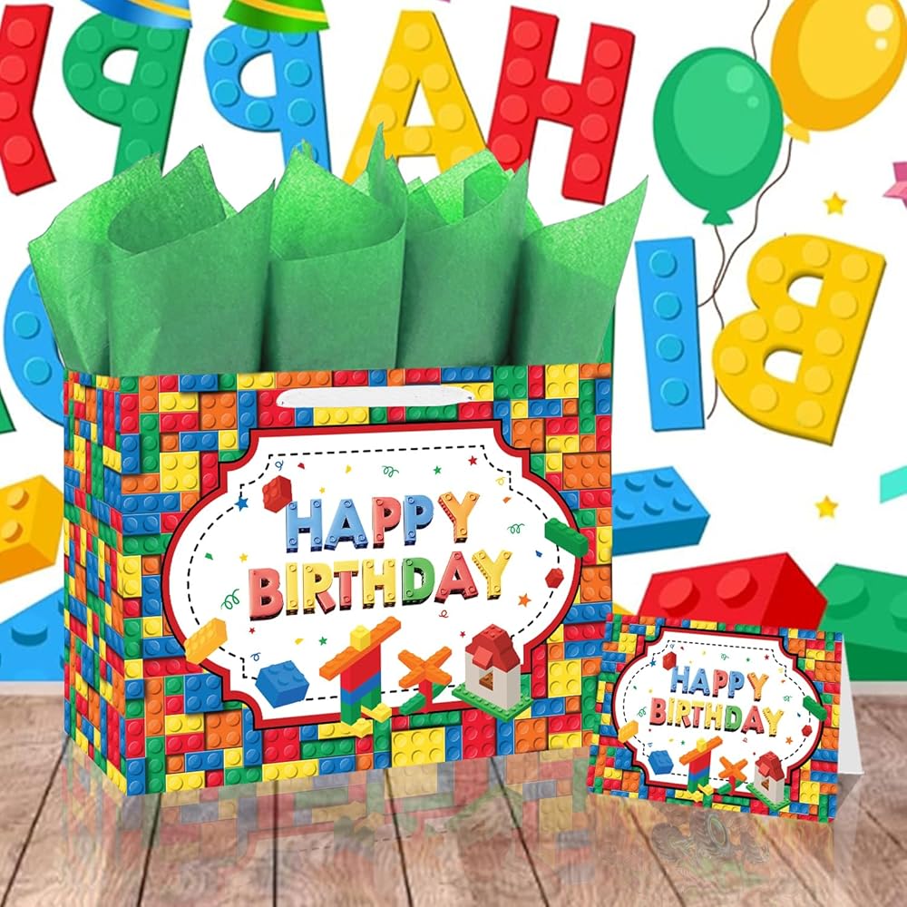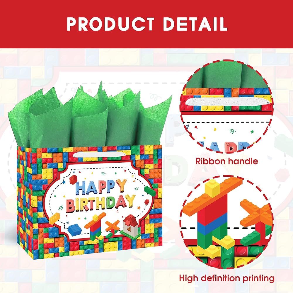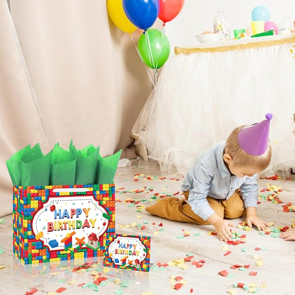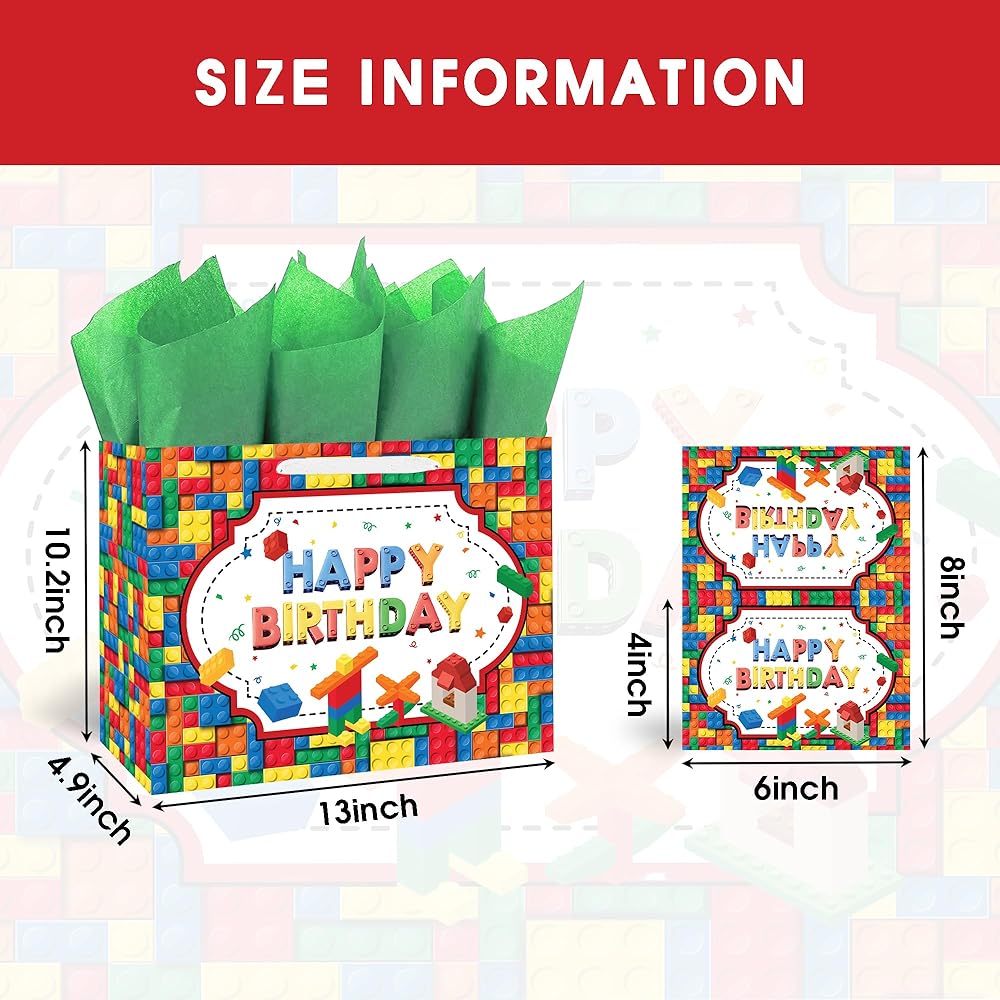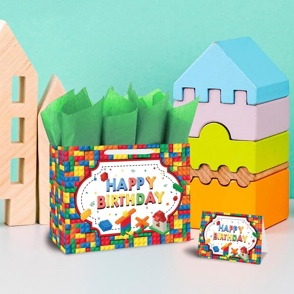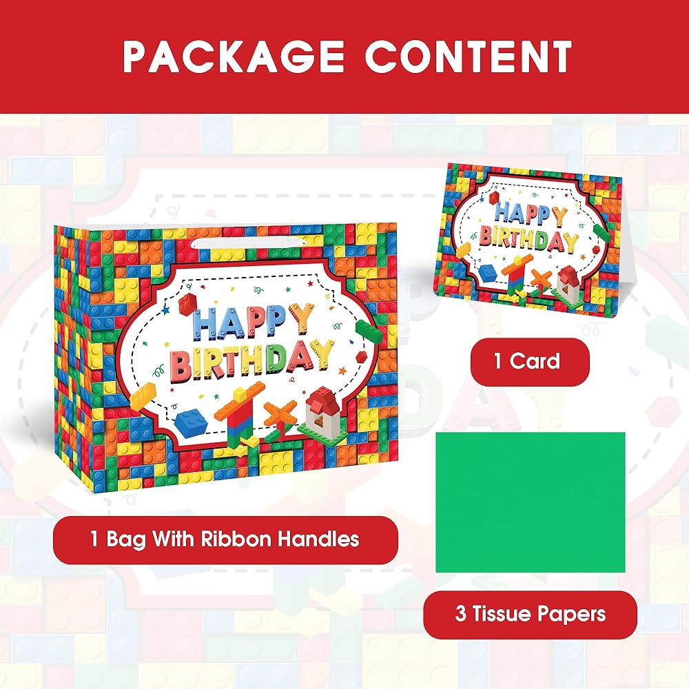🎁 【VALUE PACKAGE】: This Birthday Gift Bag Includes one Building large gift bag, 3 sheets of Blue tissue paper, and a cute greeting card; which are perfect for the need of celebrating Birthday Parties, Kids' Birthday Parties and other special occasions for loved ones.