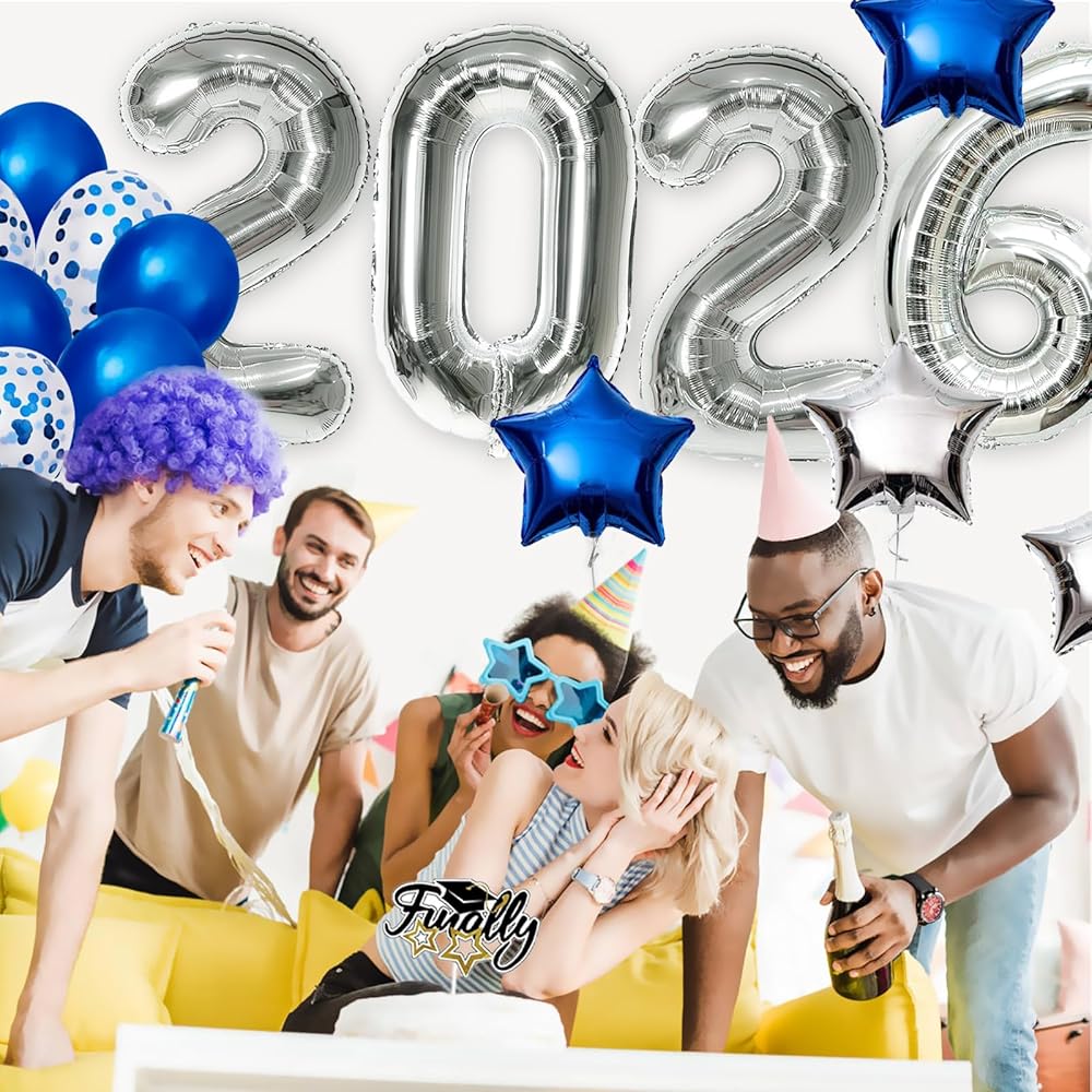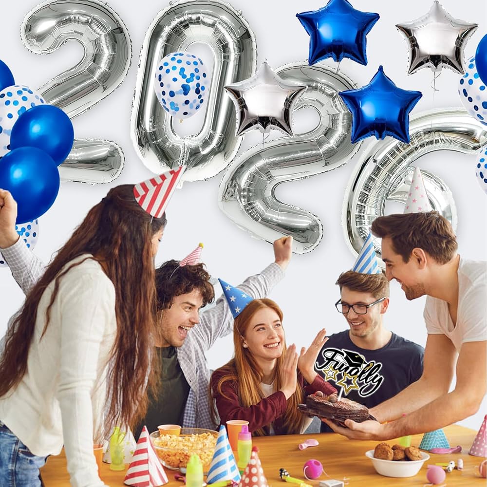 🎈 أفضل قيمة - تتضمن Balloons 2025 Baloons 2025 Silver Silver 2 ، 0 ، 2 ، 5 بالونات الأرقام+ 10 بالون الأزرق اللاتكس+ 10 بالونات شفافة زرقاء زرقاء+ 2 بالونات Silver Star Mylar Foil+ 2 بالونات فولار Silver Star Foil+ 1 Straw+ 1 RIPBOON