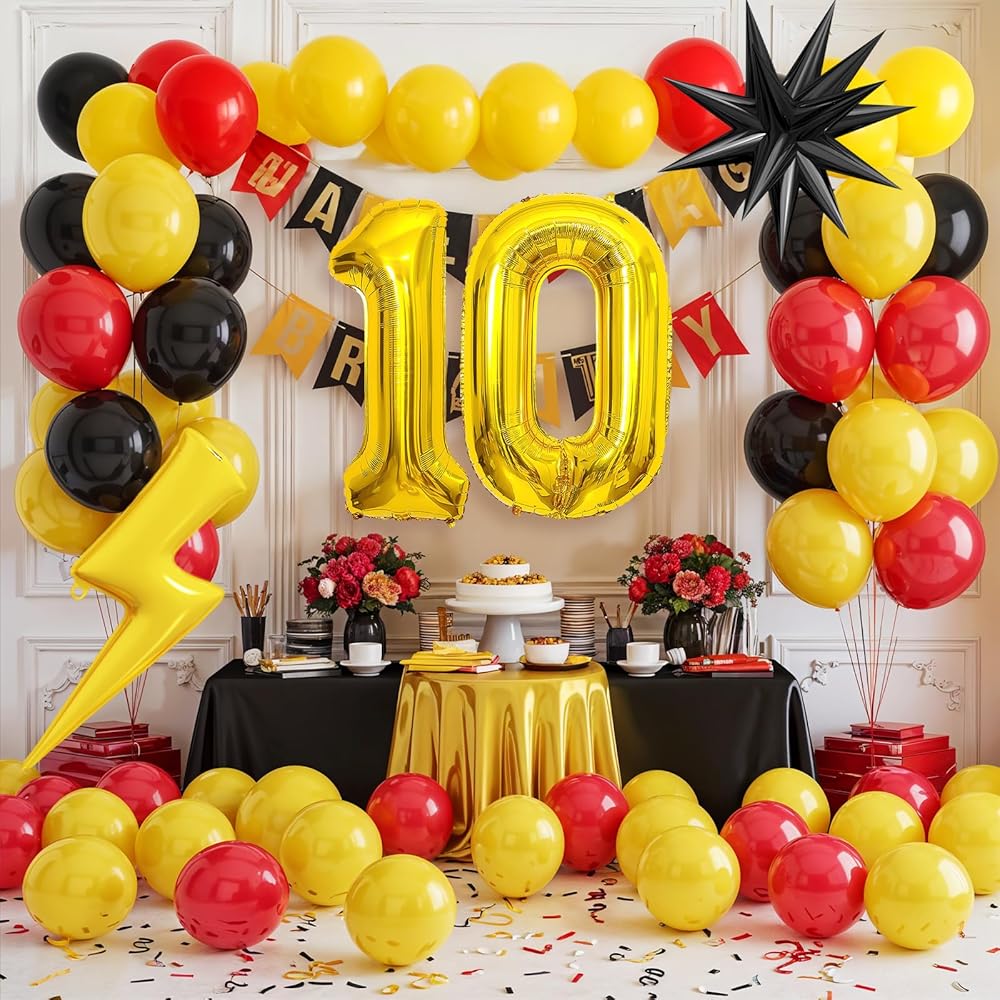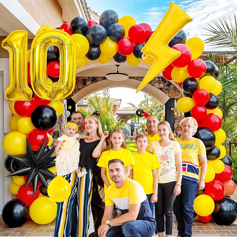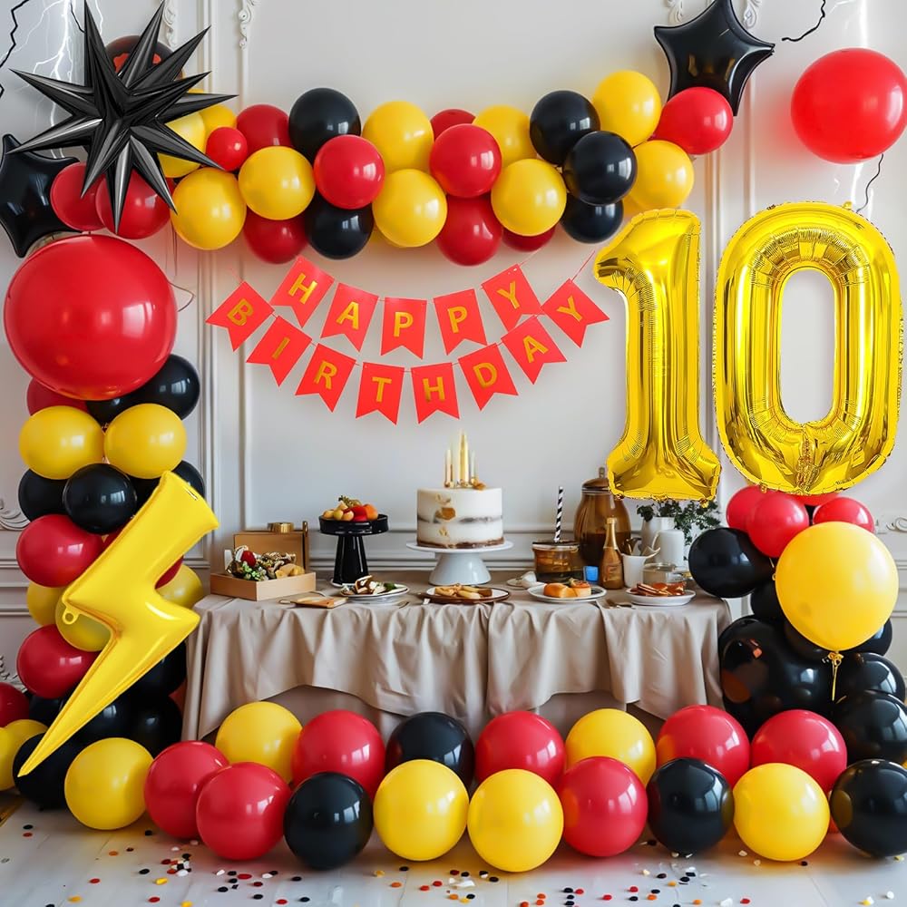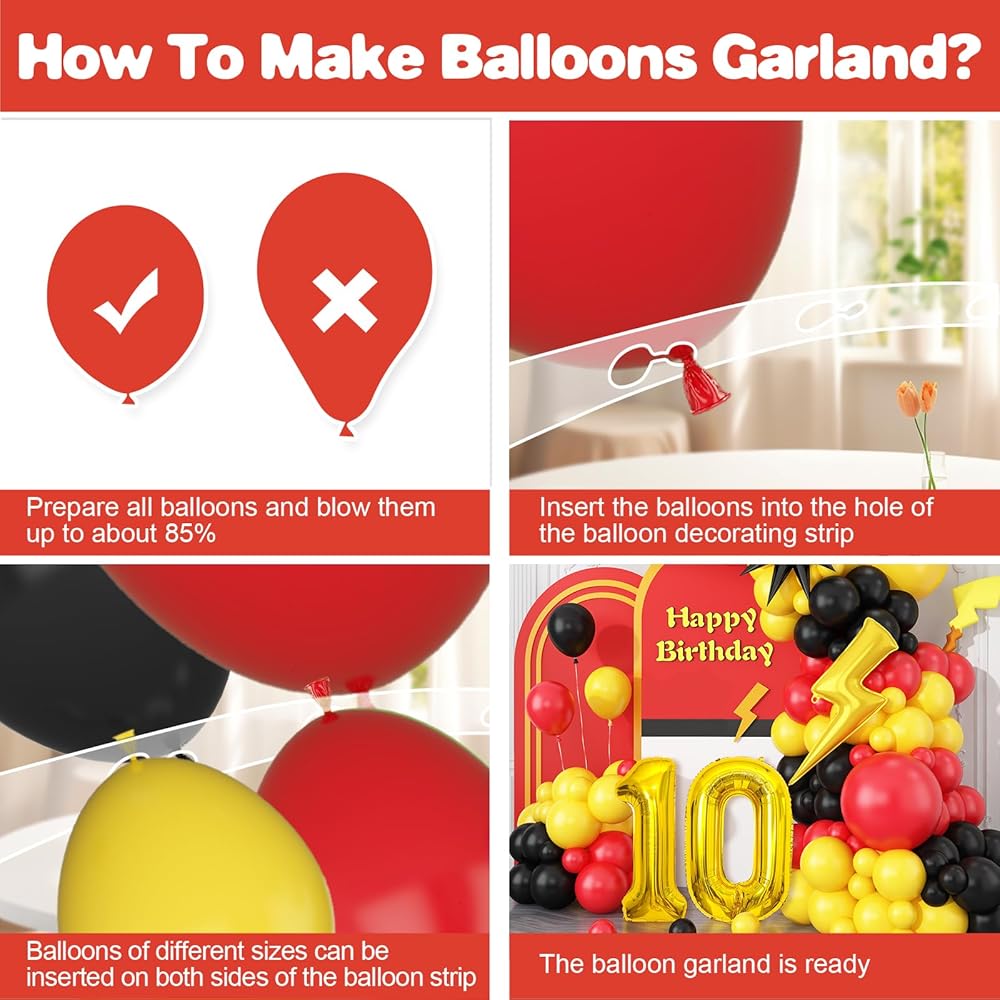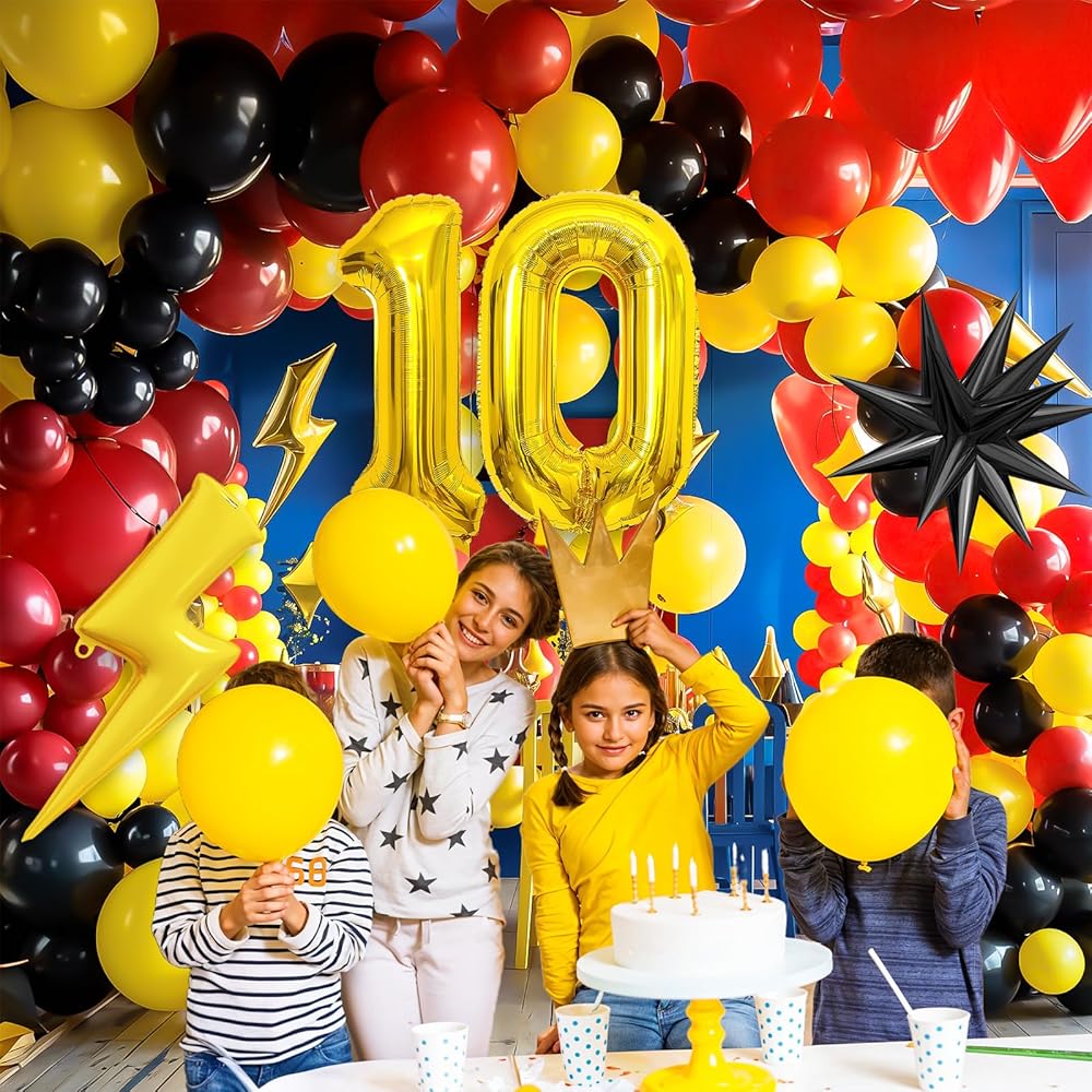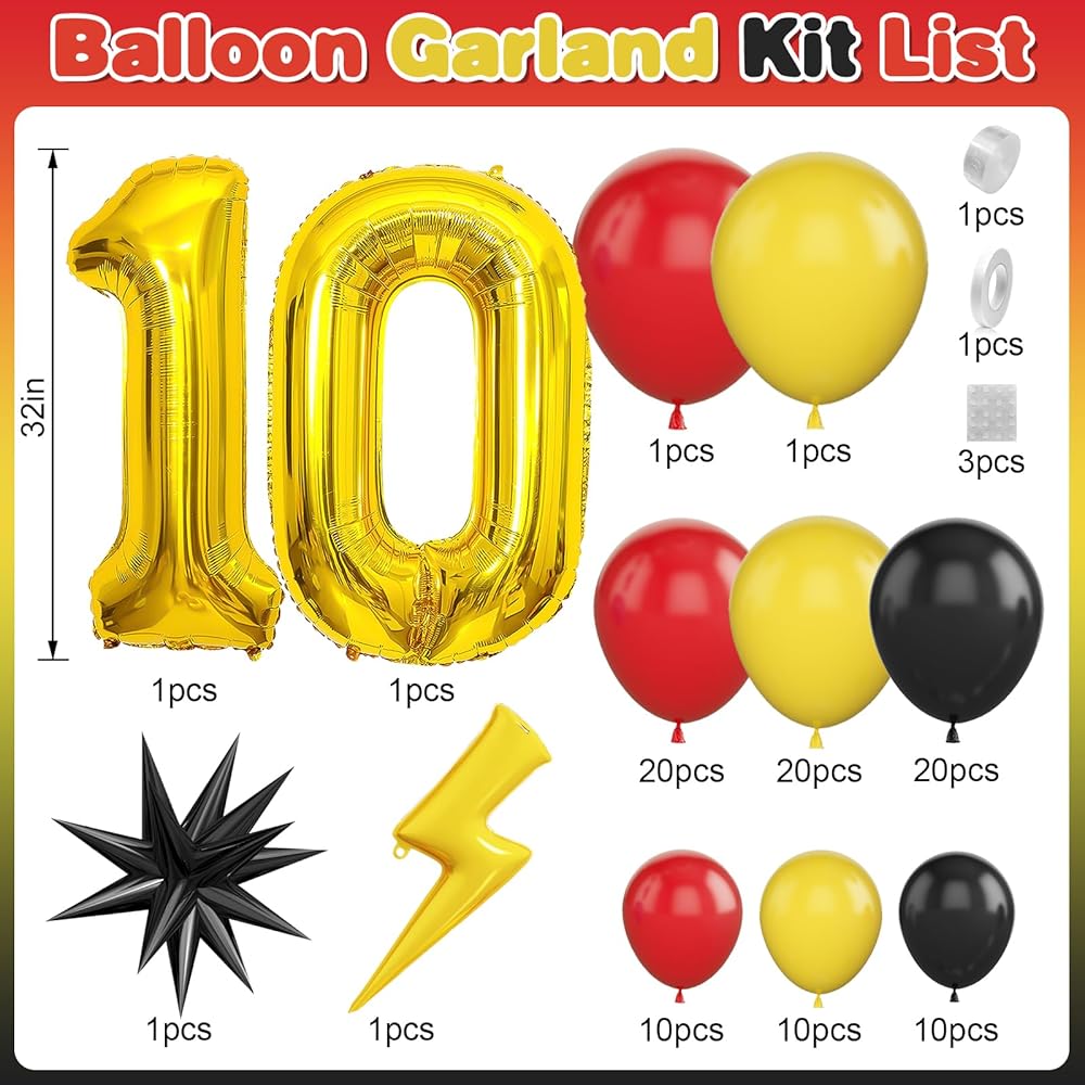 • 【مجموعة بالون عيد ميلاد 7】 قوس البالونات الصفراء السوداء الحمراء يشمل: بالون 18 بوصة (أحمر*1 ، أصفر*1) ، بالون 10 بوصة (أحمر*20 ، أصفر*20 ، أسود*20) ، بالون 5 بوصة (أحمر*10 ، أصفر*10 ، أسود*10) شريط بالون.