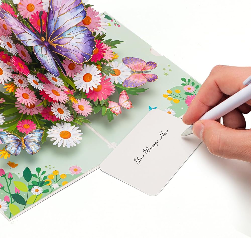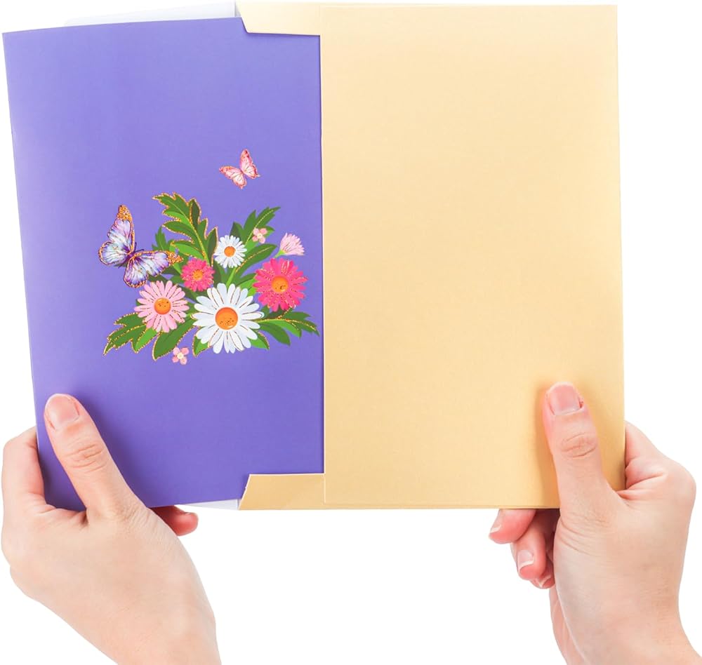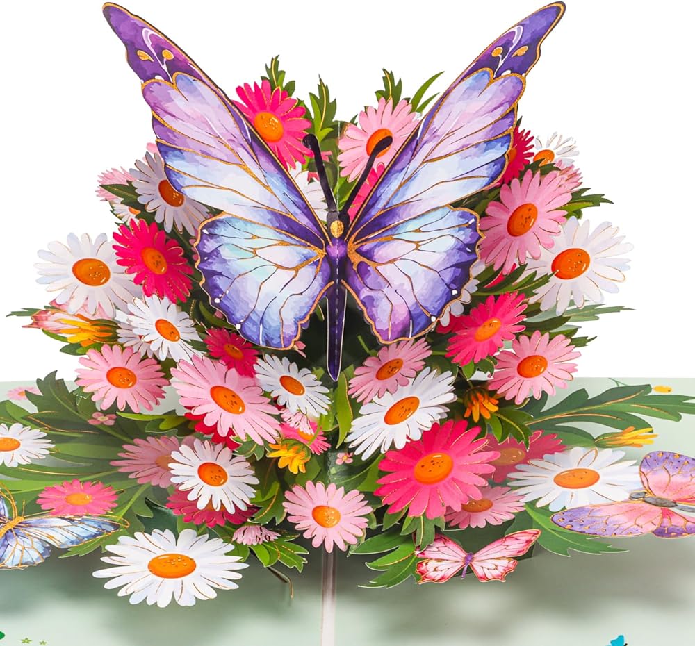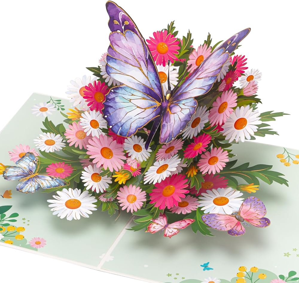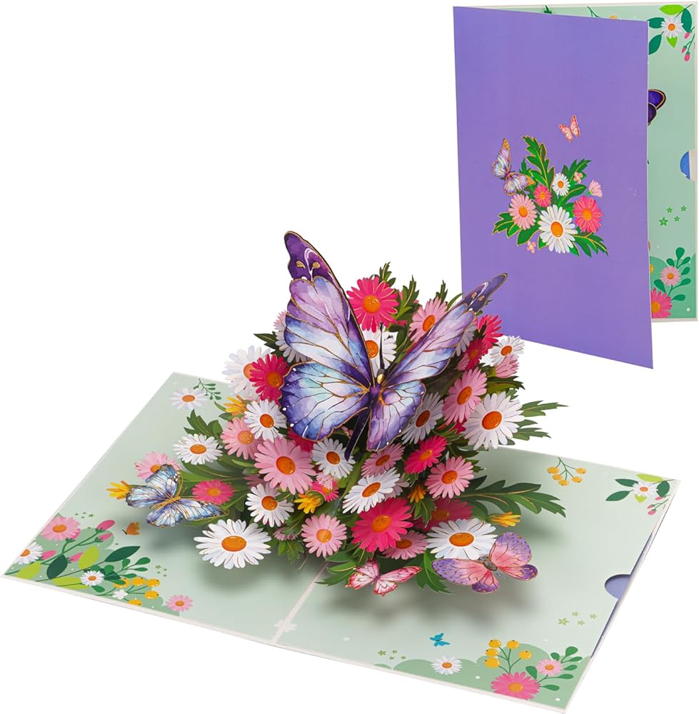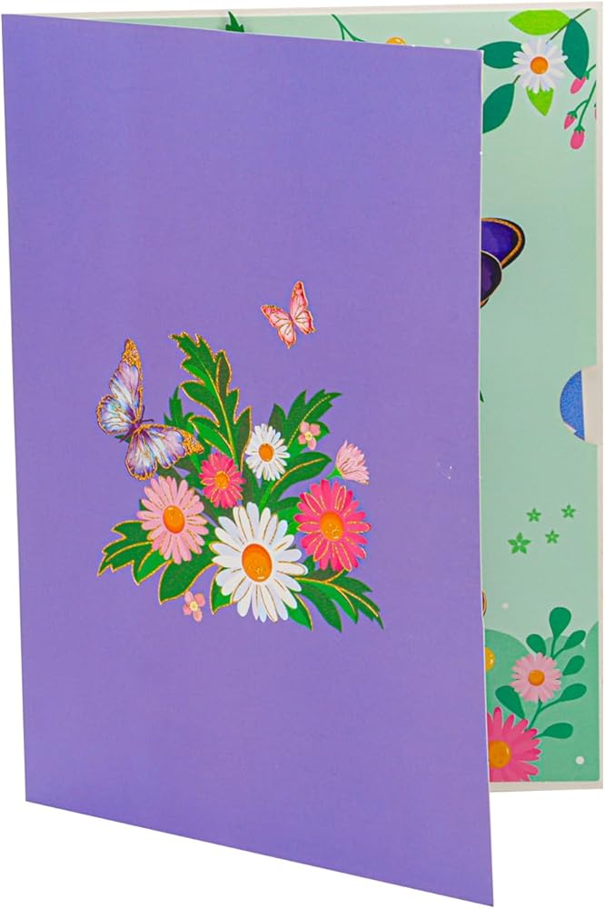 البطاقة المنبثقة الفراشة الأرجواني المصنوعة يدويًا: تتميز هذه البطاقة المنبثقة الساحرة بفراشة أرجوانية مذهلة فوق سرير من الإقحوانات والزهور النابضة بالحياة. التفاصيل المعقدة والألوان الزاهية تجعلها هدية مثالية لجلب الفرح والبهجة ليوم أي شخص.