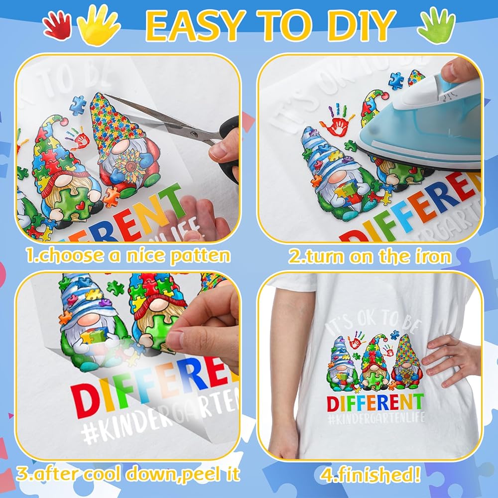 • Creative Designs: unleash your creativity with our autism transfer sets, which feature autism themed designs: autism awareness, puzzles, colorful handprints, sunflowers, trees, hearts; Freely choose the patterns you like for a delightful and personalized DIY creation; Let the spirit and your imagination come together to make delicate and vibrant designs that show your style and passion