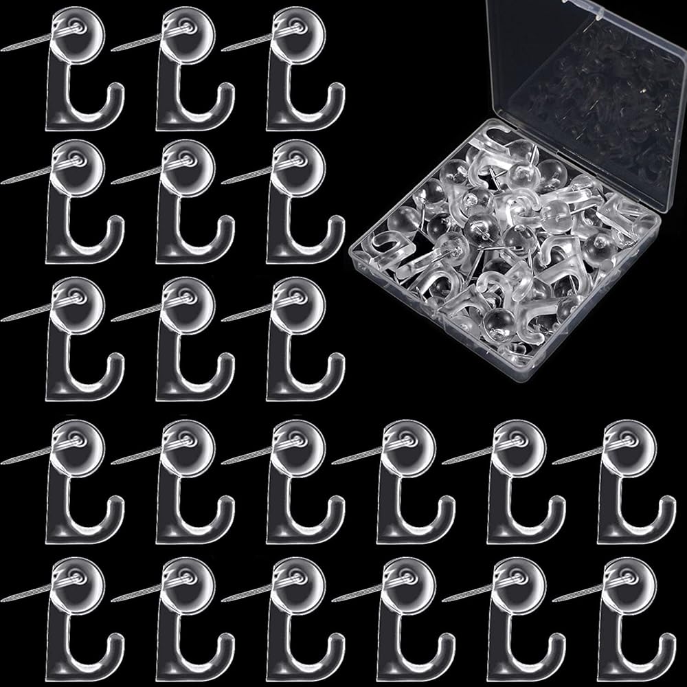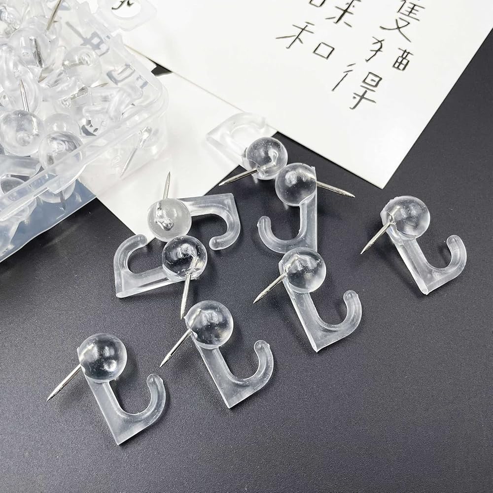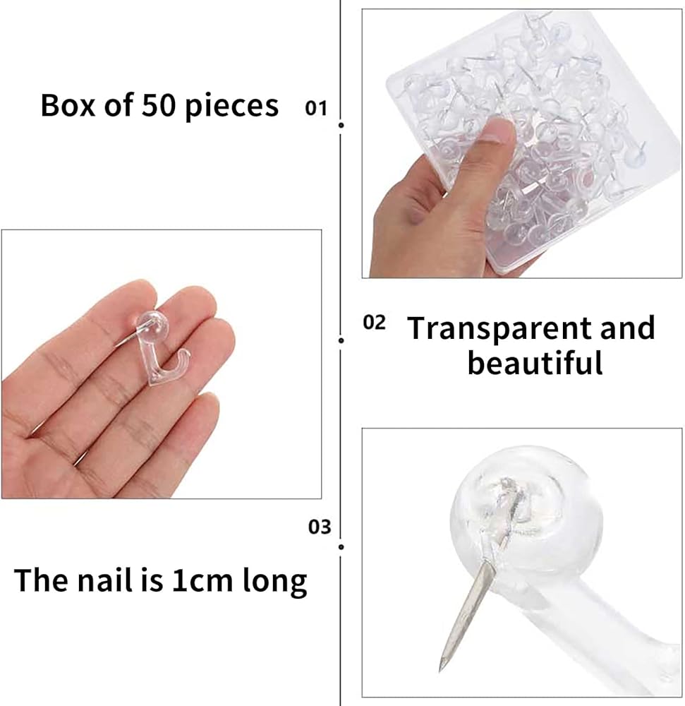 • Product Size and Packaging: Push pin picture hooks come with a clear box that includes 50 (clear color) picture hooks, 50 are enough to hang different small items in different places.