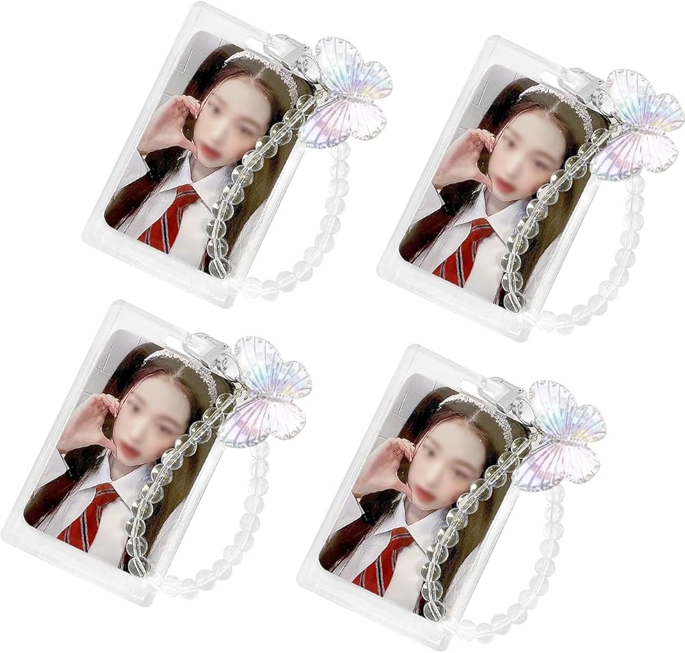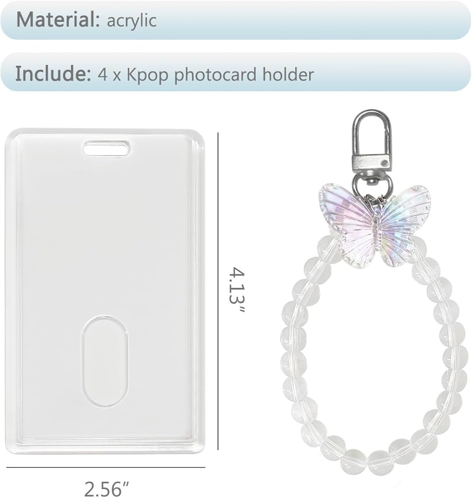 2. مجموعة كاملة: يتضمن كل حامل بطاقات صور حامل بطاقات شفاف وحلية فراشة وسوار معصم مطرز. يتميز حامل البطاقات الشفاف بفتحات مصممة بذكاء في الأعلى، مما يجعل من السهل إدخال بطاقات صور كيه بوب أو صورك. يربط المشبك المعدني حامل البطاقة بسهولة بالمعصم المطرز بالخرز، مما يضمن أمان بطاقات الصور الخاصة بك مع إضافة لمسة عصرية. تضيف تعليقة الفراشة المصنوعة من الأكريليك لمسة مبهجة وغريبة إلى حامل بطاقات الصور الخاص بك، مما يجعلها إكسسوارًا مميزًا بين المعجبين.