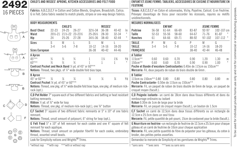 Child's and Misses' apron, kitchen accessories and felt food sewing patterns. Simplicity sewing pattern 2492, part of Simplicity Winter 2009 collection. Pattern for 7 looks. For sizes A (S - L / S - L).