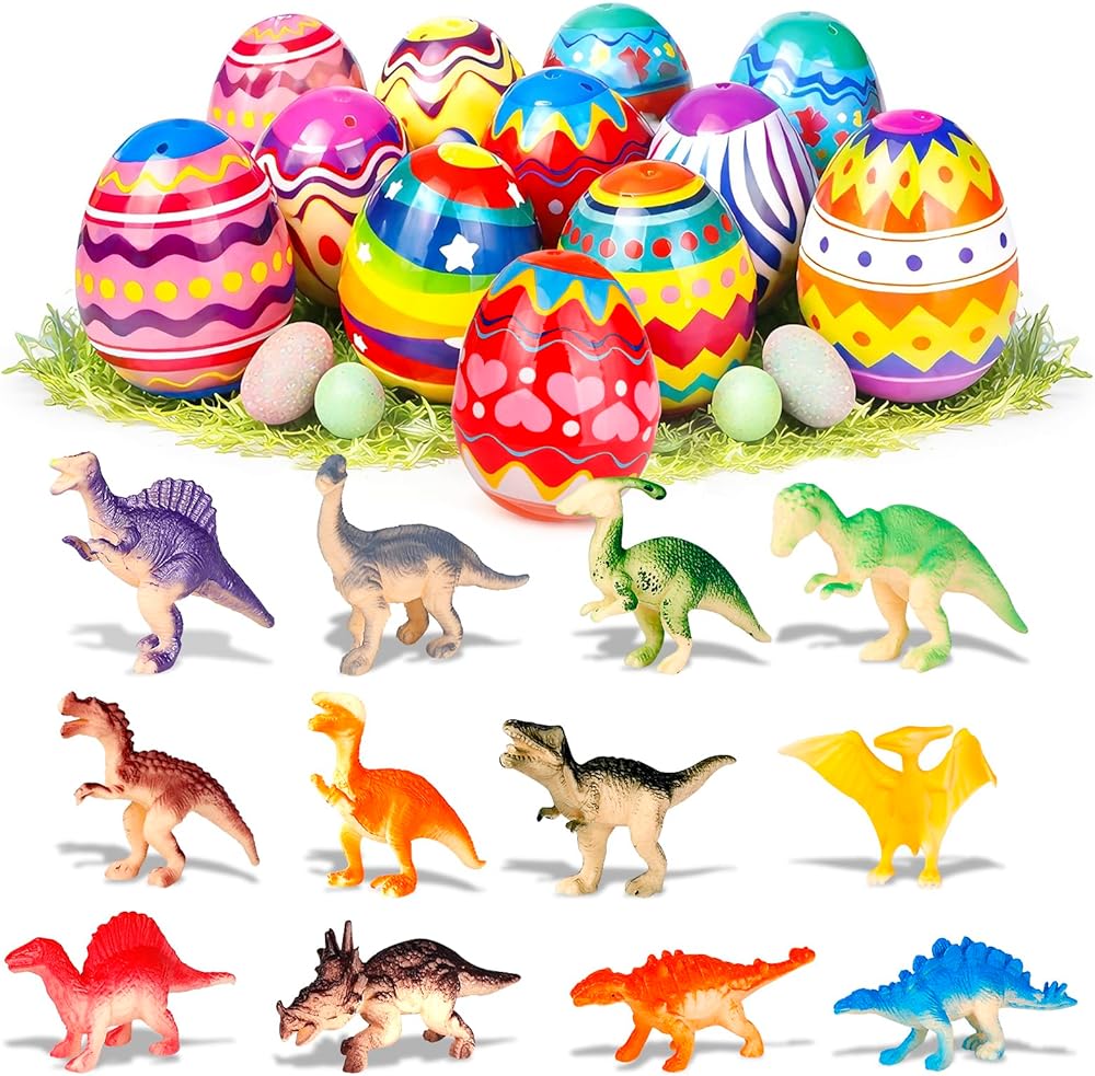 - مجموعة تشمل: 1 دزينة (12) بيض عيد الفصح مملوءة مسبقا. مسبق مع 12 ديناصور رائعتين (لون عشوائي).