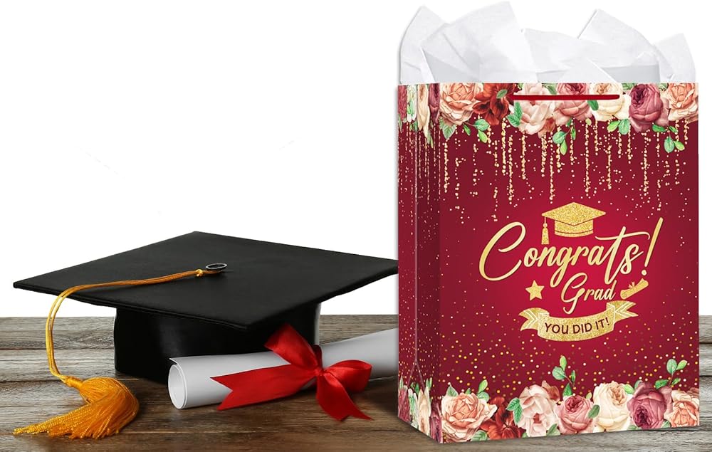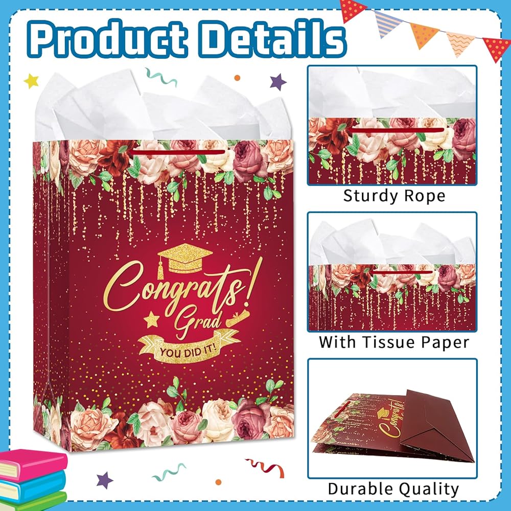 • Premium Quality Graduation Gift Bags: Made from durable, thick paper, this Graduation Gift Bag with Tissue Paper is designed to hold multiple items like books, keepsakes, and clothing. The strong handles and reinforced bottom provide added strength, ensuring your gift is safe and secure.